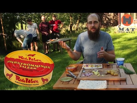 Nordische Kulinarik ist ja auch so eine Sache. Bestimmt habt ihr schon mal von „Surströmming“ gehört, oder? Das ist ein saurer Hering. Der stinkt. Gewaltig. Hier bekommt ihr jemandem im Vordergrund zu sehen, der Montags-abgehärtet ist, und die Speise einnimmt, als wäre sie süßer Honig. Im Hintergrund gibt es ein paar Monatsanfänger zu sehen…