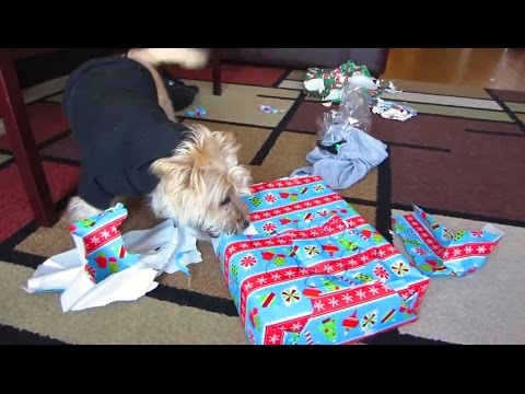 Zur Belohnung des beinahe durchstandenen Montag gibt es hier noch einige Hunde, die Weihnachtsgeschenke auspacken. Hach!