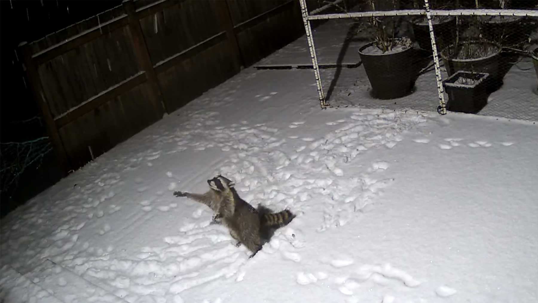 (Not so really) Speaking of „Klimawandel“: Zu Silvester hätten wir uns alle etwas kälteres Wetter gewünscht. Als Ausgleich hier ein Waschbär, der versucht, Schneeflocken zu fangen, als wären es gelungene Momente an Montag – gar nicht so leicht!