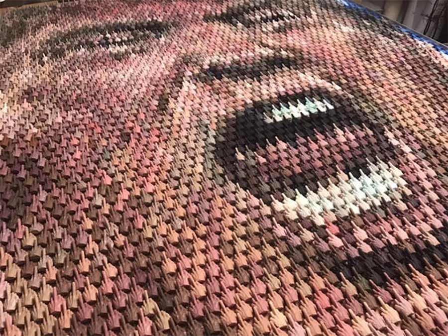 Kevin Champeny kennen treue Leser meines Blogs bereits, seitdem ich seinen Kronleuchter aus 3.000 Gummibären vor sage und schreibe fünf Jahren hier vorgestellt hatte. In der Zwischenzeit ist der in New York lebende Designer auf bildlichere Motive spezialisiert. Die bestehen dann ganz gerne mal aus den Dingen, die das Bildmotiv ausmachen. Ein „Healer“ aus 30.000 verschreibungspflichtigen Pharmazeutika, ein Bitcoin-Haufen aus 40.000 Münzen oder eben ein Portrait des aktuell amtierenden US-Präsidenten (sic!) Donald Trump aus 4.000 Mittelfingern. Stark!