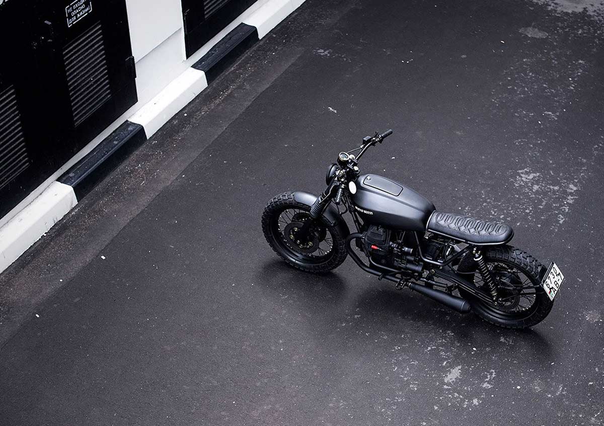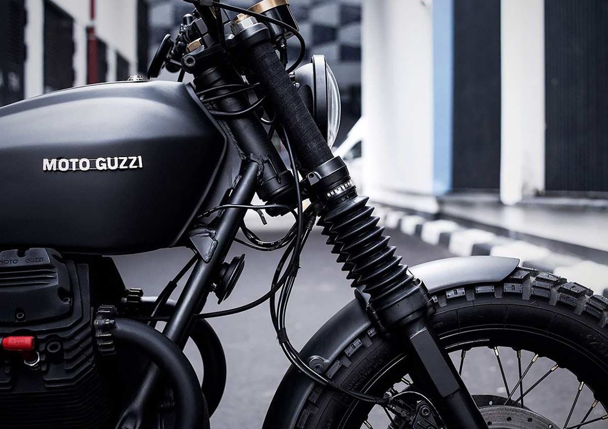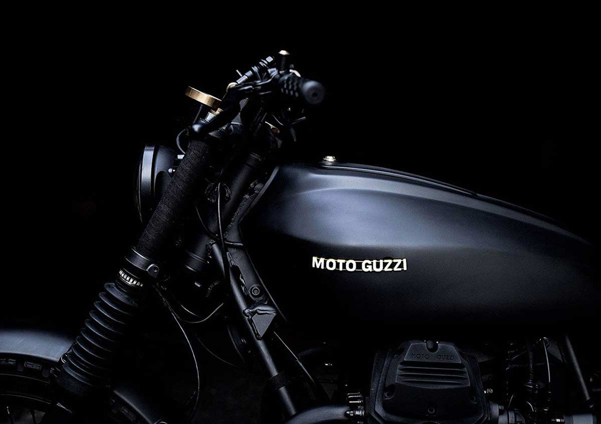 „Starting with a Moto Guzzi Nevada 750 bike from 1999, the workshop created a classic-style scrambler full of character. The team de-tabbed the frame and modified the rear section for the new shocks, while also adding a pair of footrests for a passenger along with fasteners sourced from a Moto Guzzi V35.“