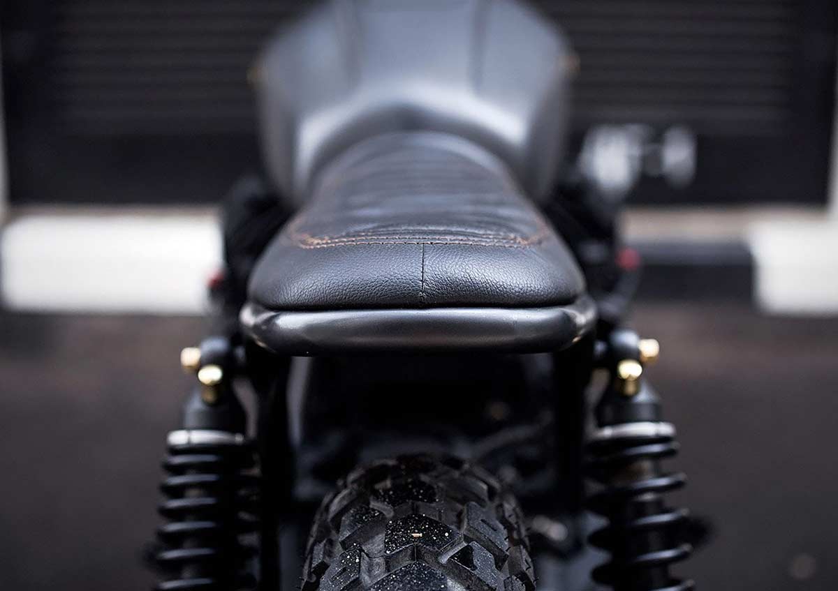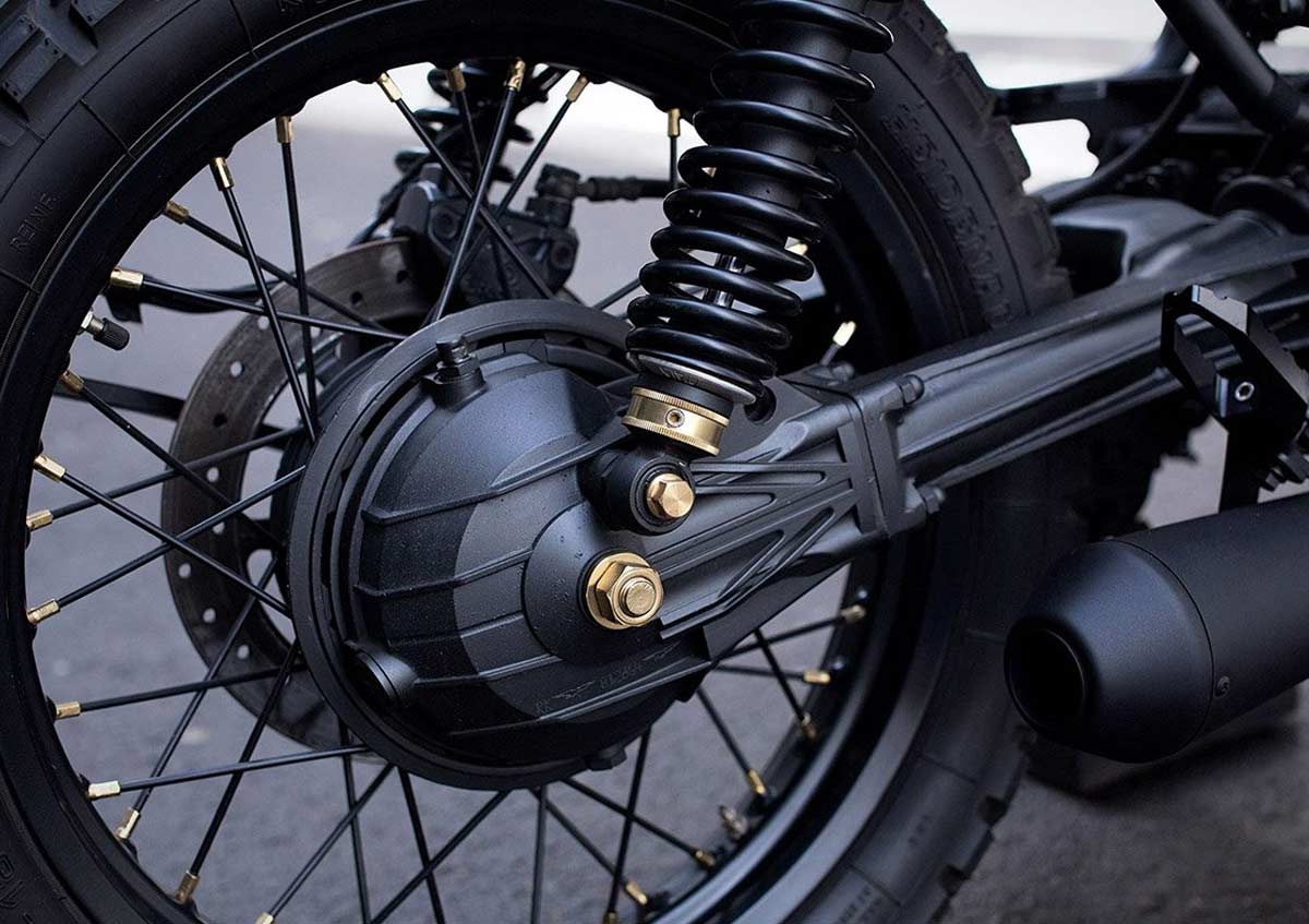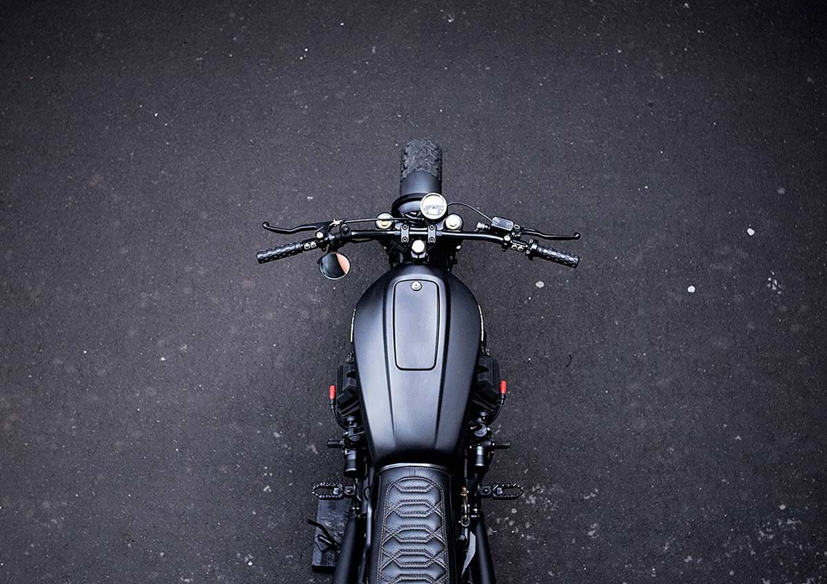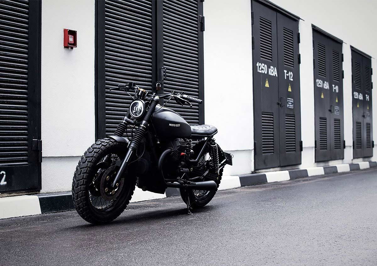„Starting with a Moto Guzzi Nevada 750 bike from 1999, the workshop created a classic-style scrambler full of character. The team de-tabbed the frame and modified the rear section for the new shocks, while also adding a pair of footrests for a passenger along with fasteners sourced from a Moto Guzzi V35.“