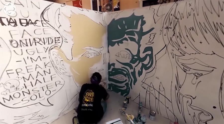 Acht Stunden hat der italienische Street Artist Solo eine Wand bemalt. Okay, eigentlich vier Aufstellwände. Im Quadrat gesetzt ermöglicht das eine wunderbare 360-Grad-Erfahrung. Navigiert euch selbst durch den Prozess, in dem per Zeitraffer das Motiv nach und nach auf den rund 24 Quadratmetern Fläche zum Vorschein kommt.