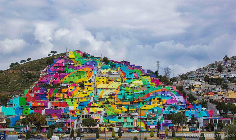 In Mexiko wollte die Regierung des kleinen Städtchens Palmitas den Zusammenhalt zwischen den Bürgern stärken und etwas für die Atmosphäre tun. Beauftragt wurde daraufhin die Street Art-Gruppe Germen Crew, die aus der Berghang-Nachbarschaft ein gigantisches und farbenfrohes Mural erstellt hat. Auf 209 Hausfassaden und über 20.000 Quadratmetern Fläche. Klasse!