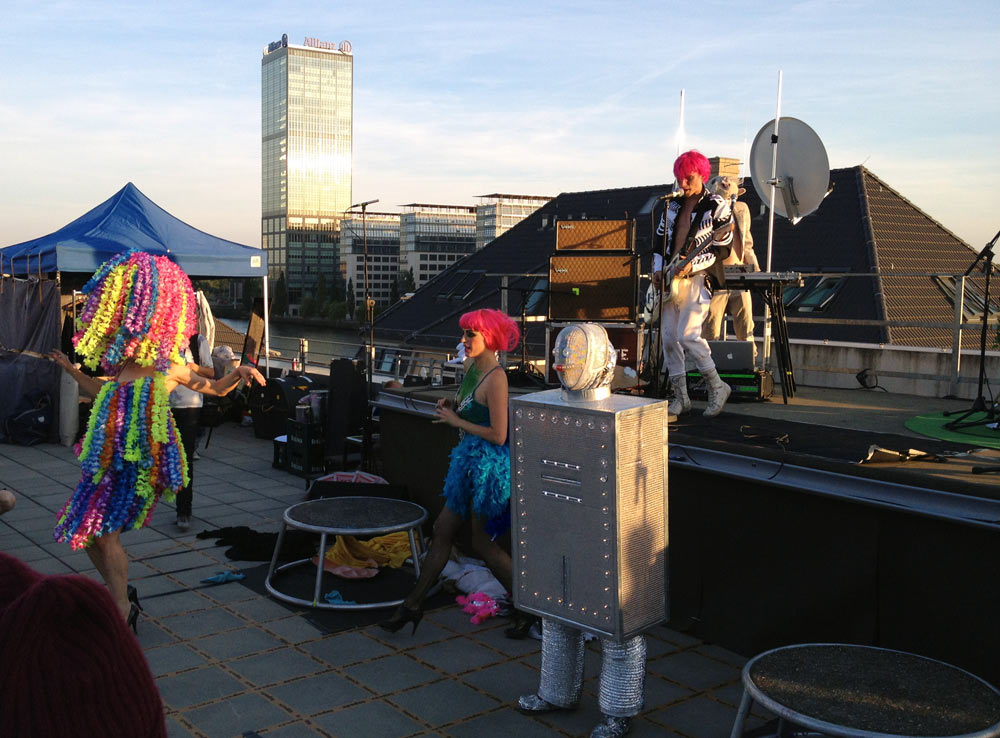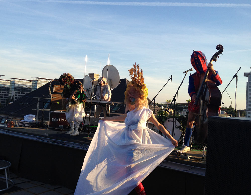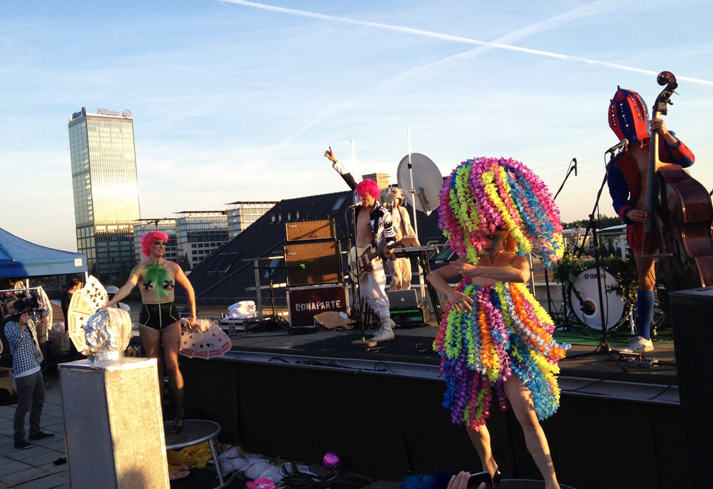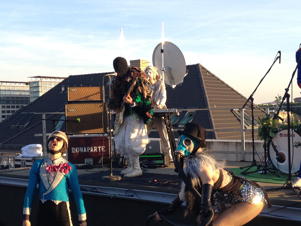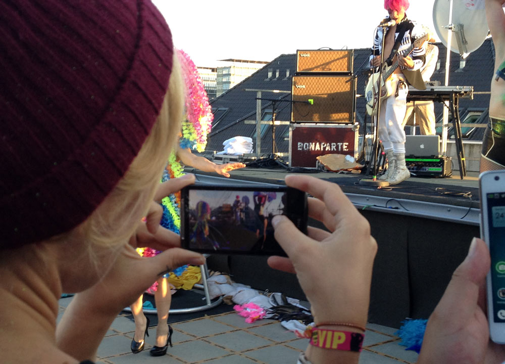 Mia. war auch da. Und dann kam das eigentliche Highlight – Bonaparte. Die Jungs und Mädels haben bereits im Vorfeld ordentlich mit dem und im Publikum herum geflachzt. Und dann ging es auch musikalisch los. Der Großteil der Journalisten schien nicht ganz erwartet zu haben, was da an Show geboten wird und es wurde ein reiner Foto-Marathon. Dazu war der Sound um Längen besser als noch am Tag zuvor auf dem Berlin Festival. Sehr guter Auftritt, finde immer noch grünen Glitzer überall. Ich lasse euch einfach mal mit ein paar Bildern alleine. Und natürlich auch diesem Gesamtauftritt im Video!