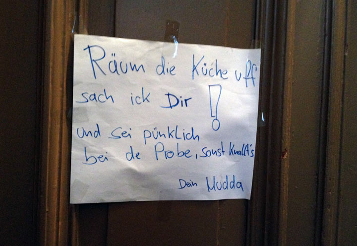 Freitagmorgen ging es in die Hauptstadt, aus arbeitstechnischen Gründen. Schnell die Agenturkollegen besucht und danach den Kopf auf Freizeit gestellt. Genauer gesagt auf Feiern und Festivals. Netterweise sind wir bei Studienkollegen meines Reisegefährten unter gekommen, die in extrem guter Lage wohnten. Da wurde man schon einmal im Treppenhaus auf dem Weg zum fünften Stock mit seltsamen Nachrichten begrüßt…