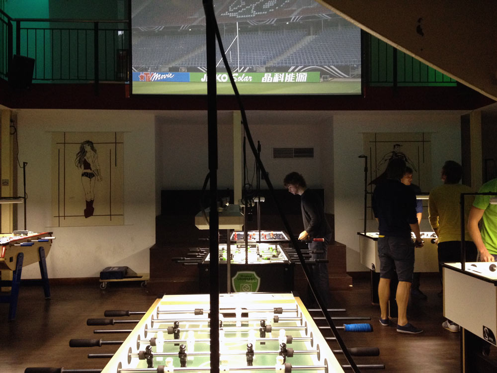 Aber auch sonst hatten wir Glück mit der Lage. In Wurfweite lag das „Burgeramt“, das uns die schmackhafte Grundlage für den langen Abend bieten sollte. Und nicht zu verachten ein Späti, der sein Hauptaugenmerk bei der Produktpräsentation sicherlich nicht auf die Pasta gelegt hat. Nach der Grundbasis an Verpflegung wurde gepflegt das Länderspiel geschaut. In der Longshot Bar, die mehr Kickertische als Gäste an dem Abend hatte. Dennoch eine coole Idee.