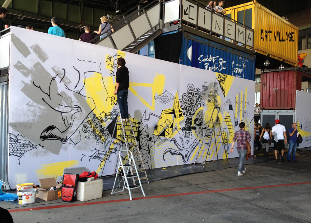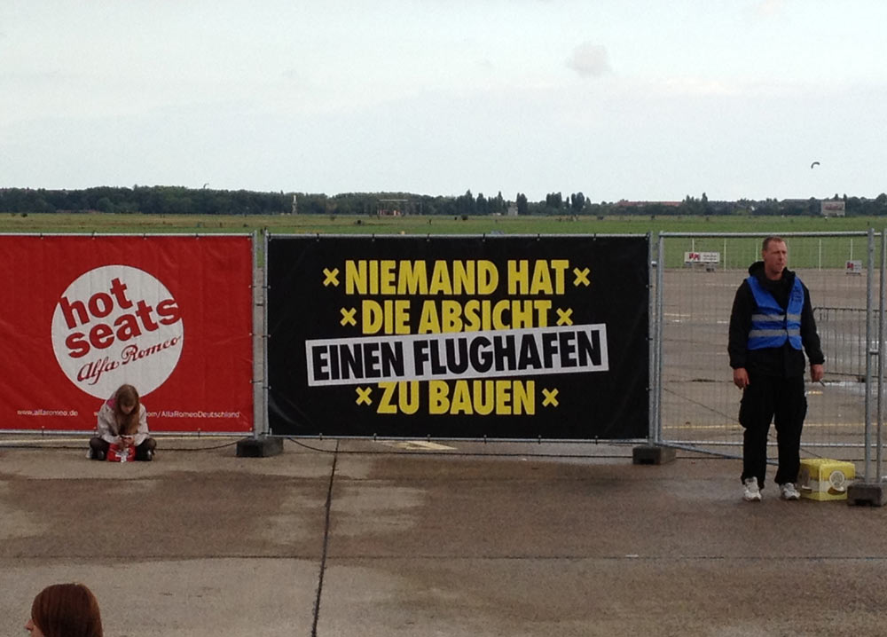 Auch die Kunst hatte ihren (kleinen) Platz auf dem Gelände. Leider hatte ich vergessen, noch ein Nachher-Bild dieser Wand-Kreation zu machen, aber sei’s drum. Und auch an flotten Plakatsprüchen hat es in Berlin natürlich nicht gefehlt.