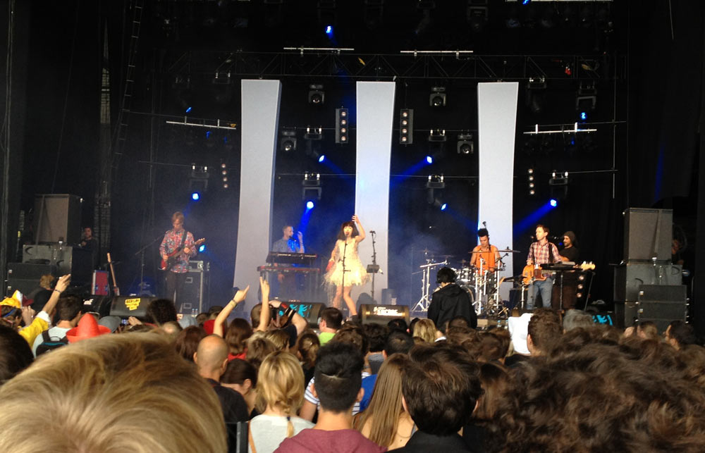 Bei Kraftklub waren dann zwar alle Instrumente zu hören, jedoch nur auf Zimmerlautstärke. Etwa 30 Meter von der Bühne entfernt konnten wir uns normal unterhalten. Dennoch haben die Jungs es geschafft, eine richtig gute Show abzuliefern und vor allem der Vergleich „Wer ist Hipster?“ zu „Wer sieht einen Hipster vor sich?“ hat gut funktioniert.
