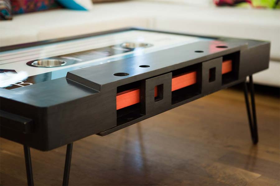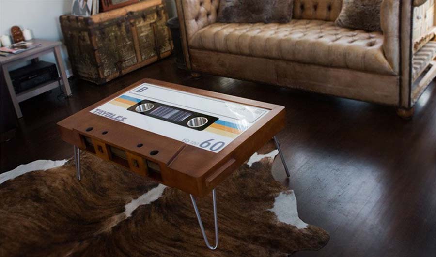 „Modern Design Just Got a Retro Look! The Cassette Tape Coffee Table is built to scale with a whiteboard top & hidden storage“