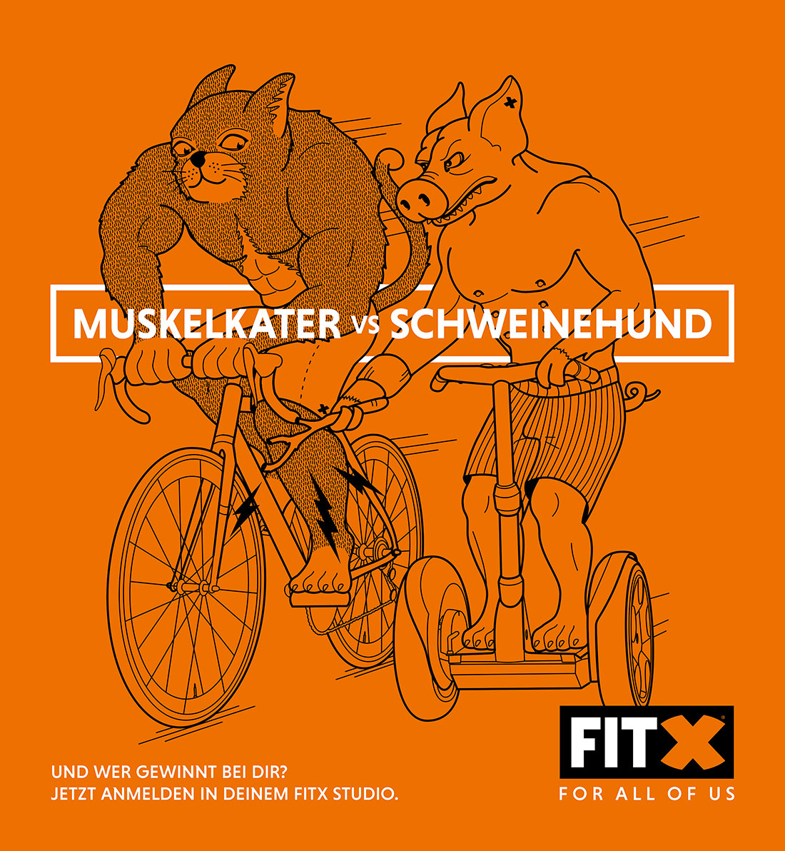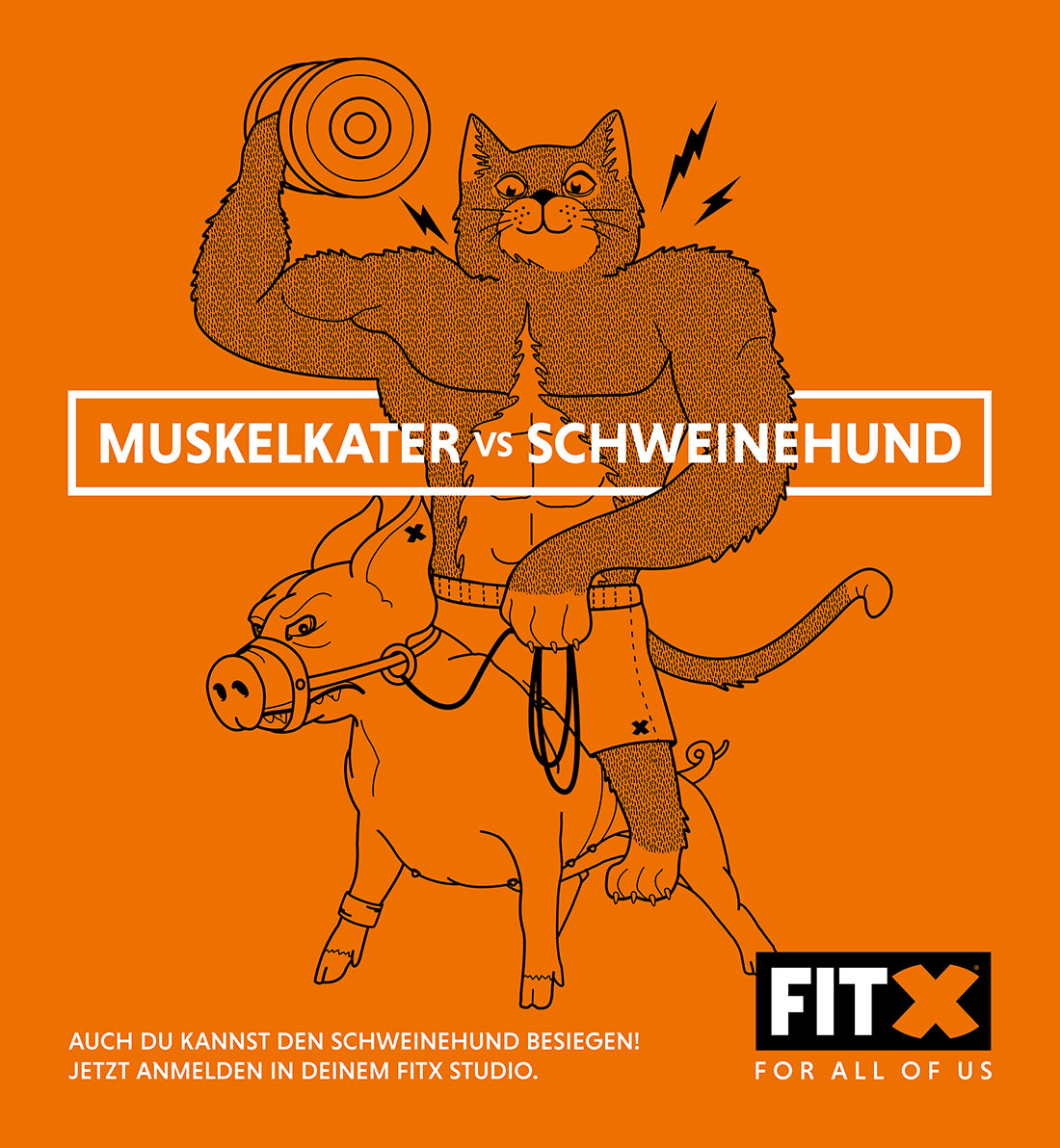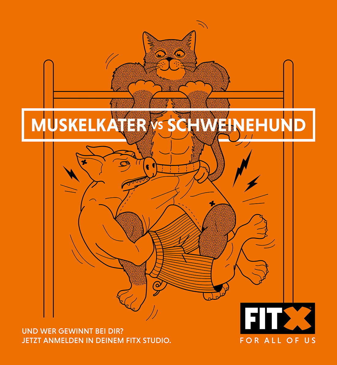 FitX hat die Antwort: den Muskelkater. Viele denken, auch der wäre ein negatives Fabeltier, aber nein, er ist das erste Zeichen des Fortschrittes. Der erste Schritt gegen den Schweinehund. Quasi DER Superheld, wenn es im Kampf um den Superbösewicht geht, der Gesundheit und Körpergefühl von euch herunterziehen will. Passend dazu hat das Unternehmen jüngst eine Reihe mit vier Motiven veröffentlicht, in denen Muskelkater und Schweinehund im direkten Wettkampf aufeinander treffen. Kreative Idee und sportliche Motive!