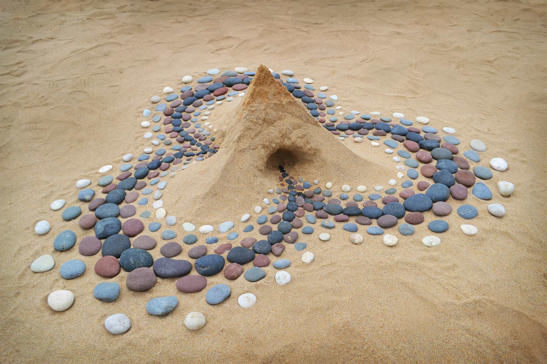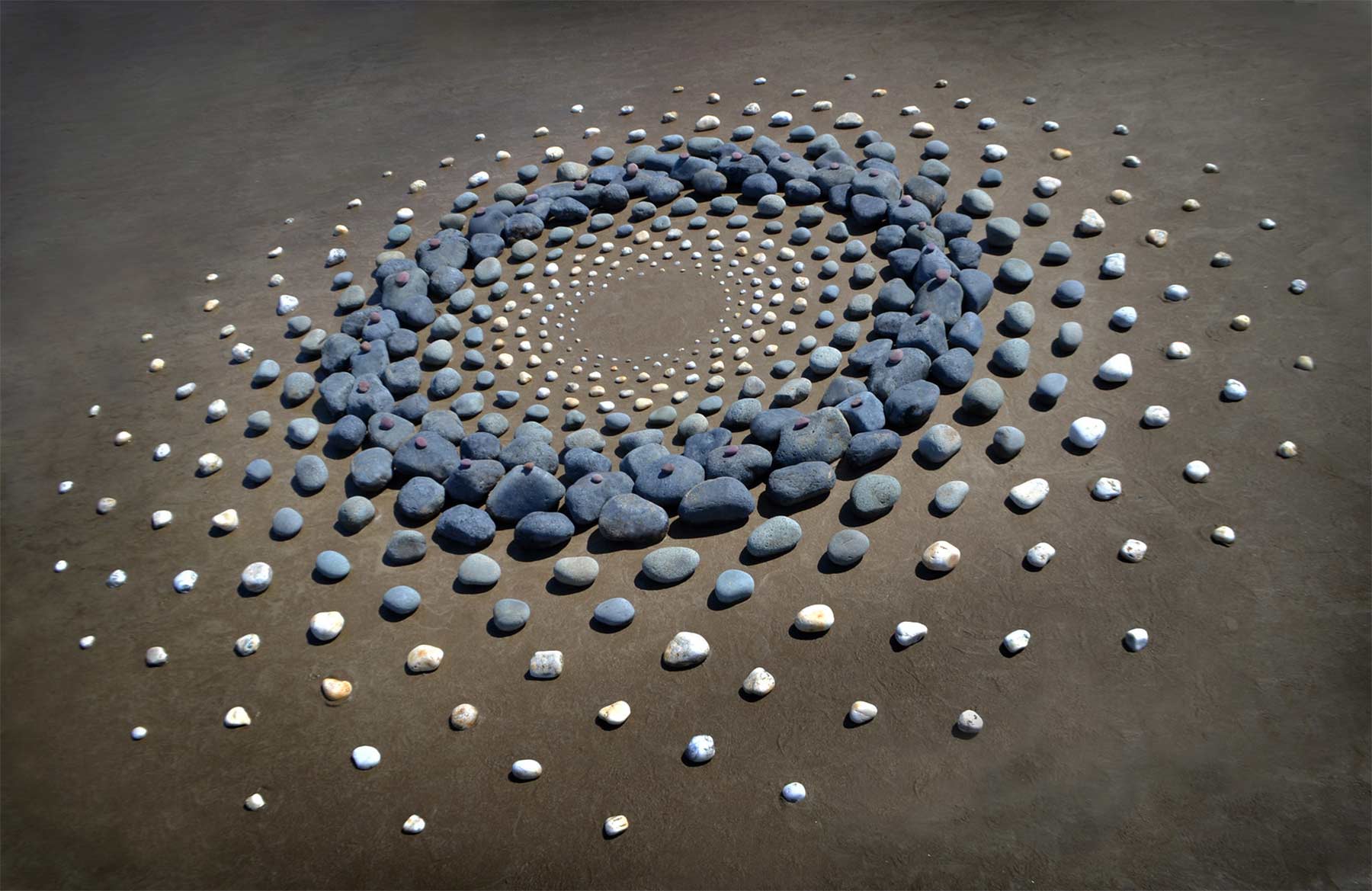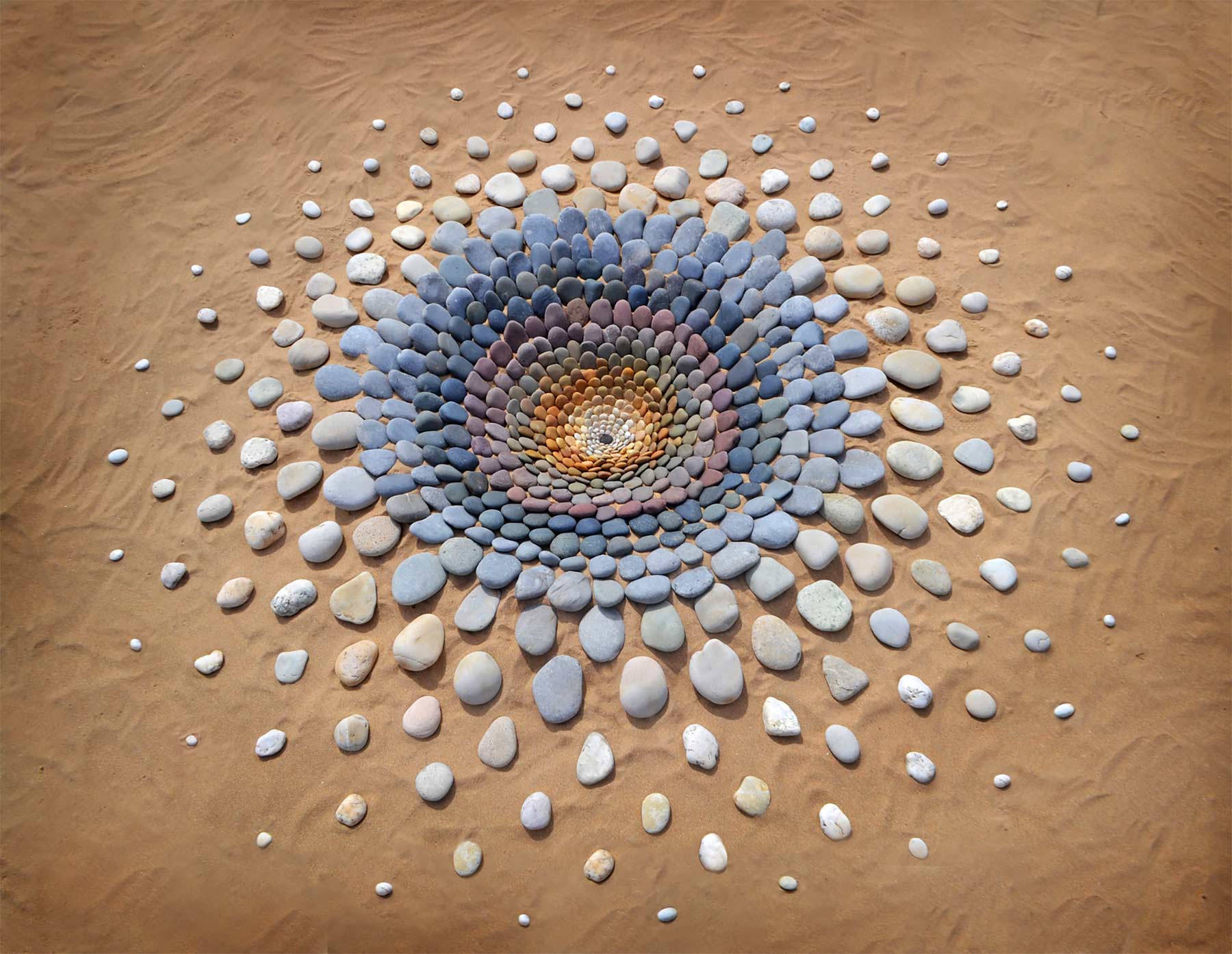 Aber nicht nur Steine sind sein Element. Sind gerade keine vorhanden, genügt Jon Foreman auch der einfache Sand am Strand, um Muster hinein zu ritzen und laufen, die zuweilen an Mandalas erinnern. Bis die Wellen oder der Wind sie sich wieder holen…