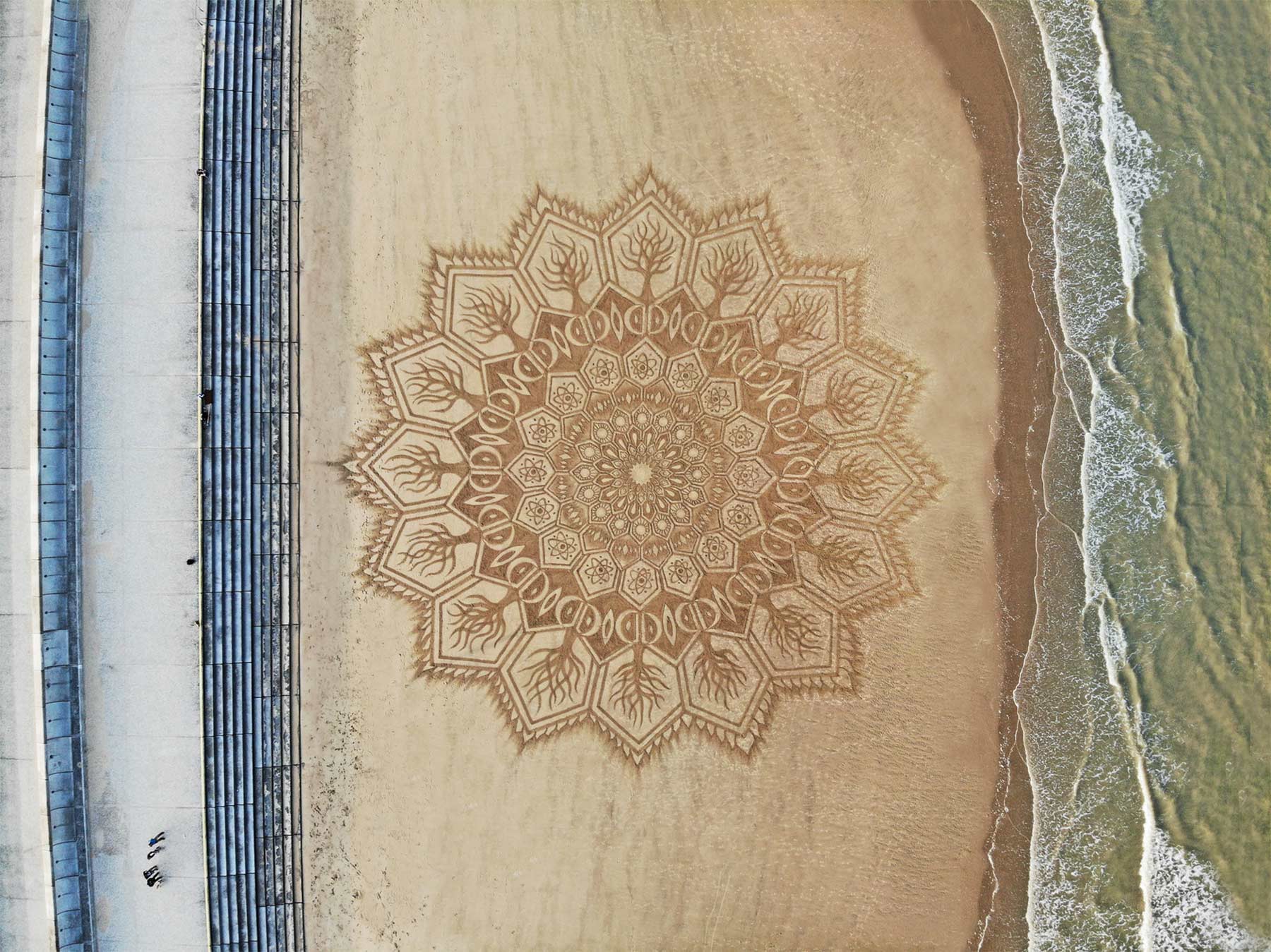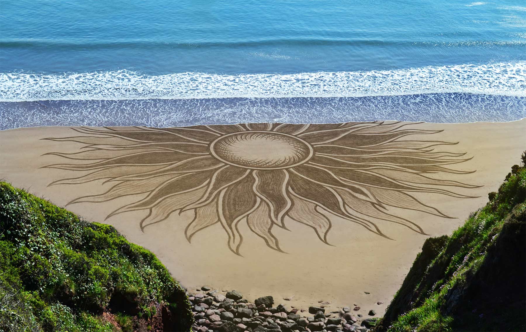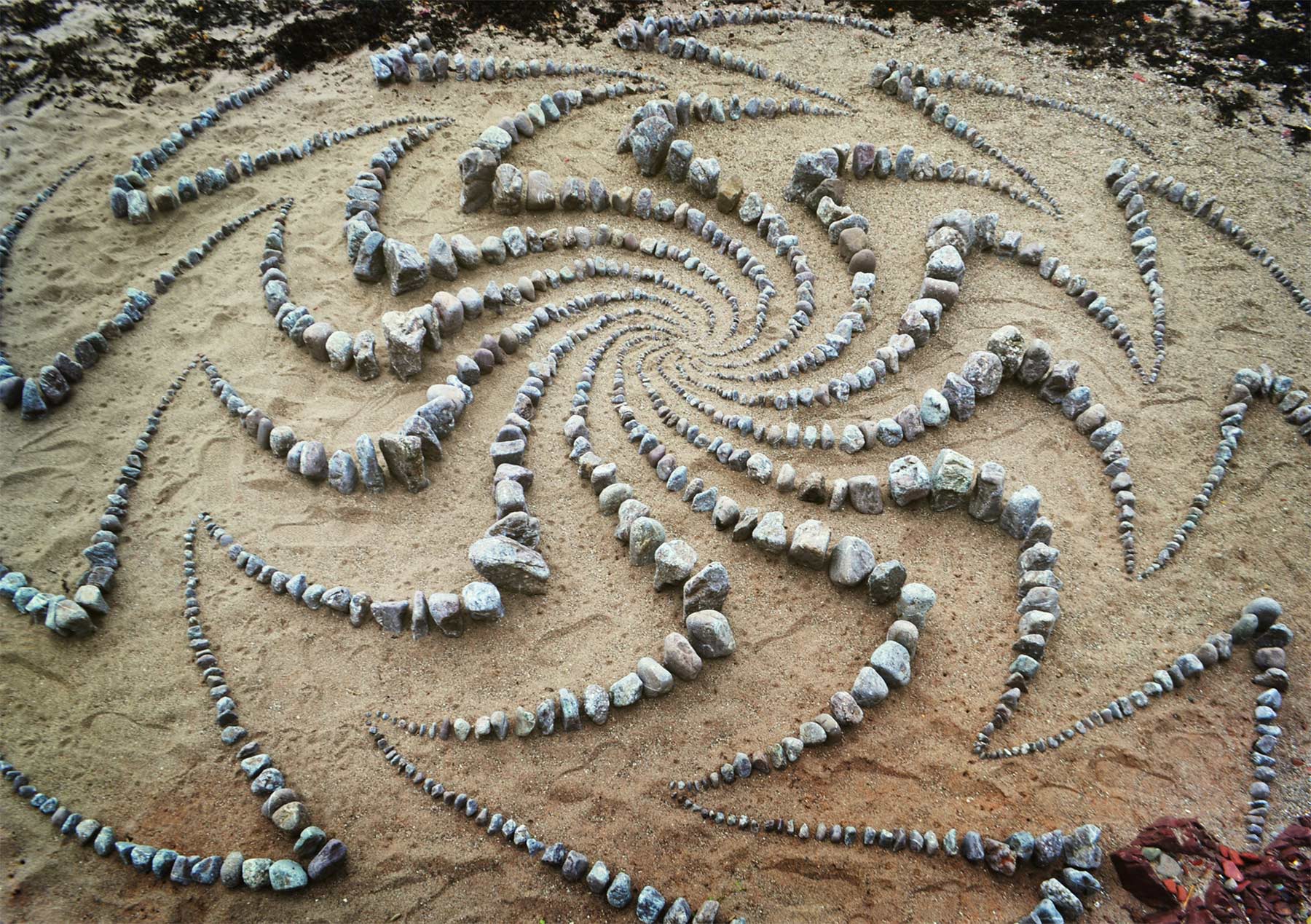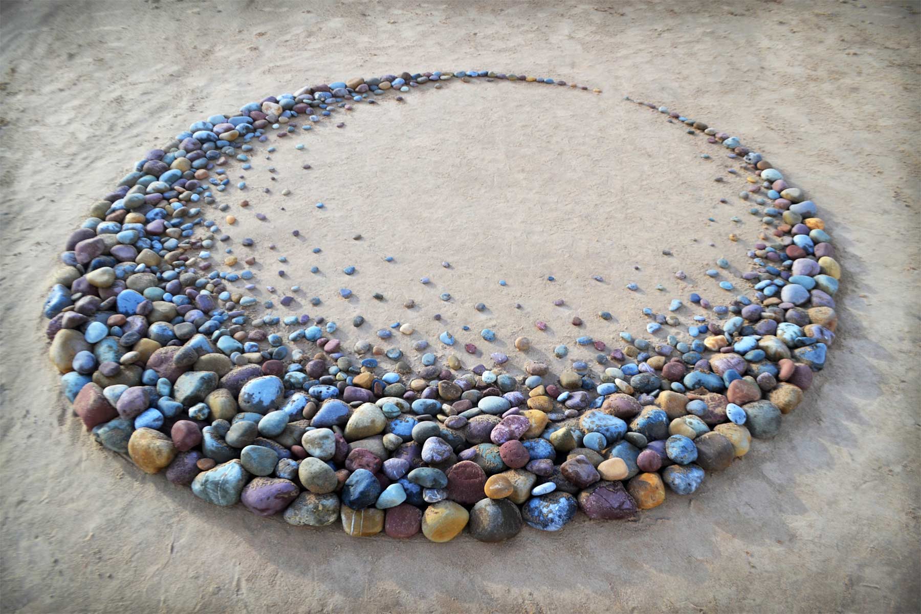 Aber nicht nur Steine sind sein Element. Sind gerade keine vorhanden, genügt Jon Foreman auch der einfache Sand am Strand, um Muster hinein zu ritzen und laufen, die zuweilen an Mandalas erinnern. Bis die Wellen oder der Wind sie sich wieder holen…
