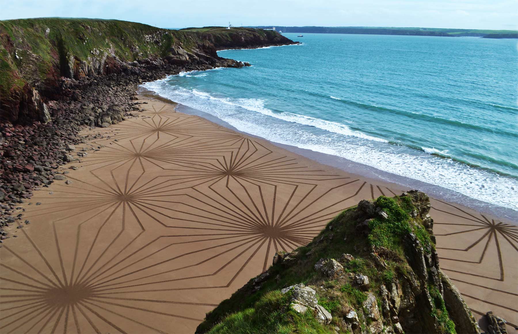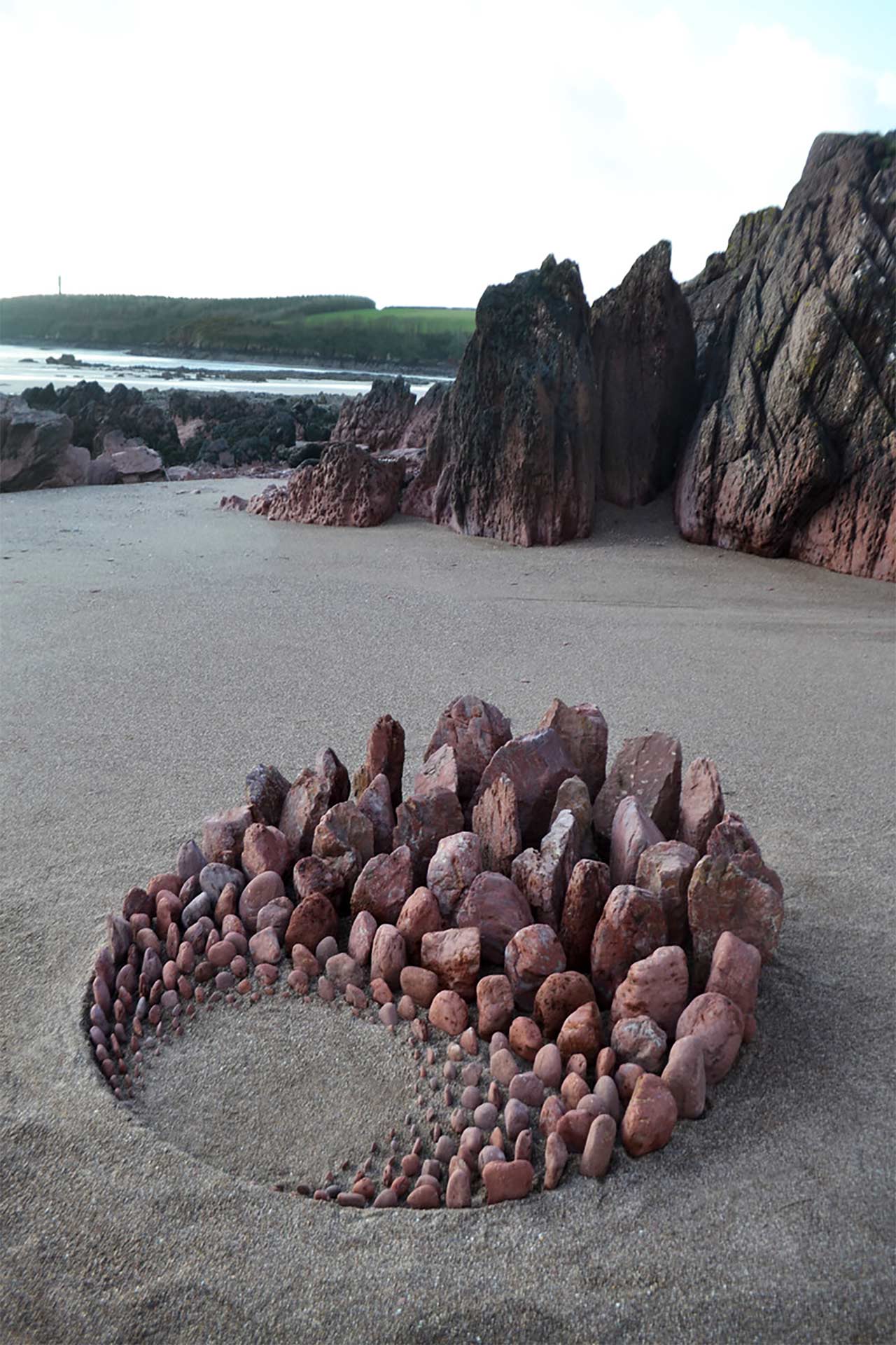 „A creator of various styles of Land Art, he is ever in search of ‚different.‘ Be it with stones or leaves, inland or on beaches. He has even created works in derelict environments using materials such as broken glass or ashes and general debris. The scale of his work varies massively; he may use stones or driftwood to make something small and minimal. Otherwise he may be seen drawing massive scale sand drawings up to 50 metres across. His work is ephemeral in many differing ways; Most often the weather and immediate climate will make his work disappear (be blown down/washed away by the tide), and sometimes other people will interfere. This is all part of the creative process and has proven to benefit his work. Jon’s practice is not just something he enjoys but it is also a therapy for him, an escape from the stresses of everyday life. Jon began his journey making Land Art/Sculpture while in college but he feels his creative play with materials and innovative ideas are something which started long before. Most of his work takes place in an already beautiful setting such as the Pembrokeshire coastline. Having grown up there he saw the beauty of the coastline and woodlands and made use of them by collaborating with nature itself.“ (Artist Statement)