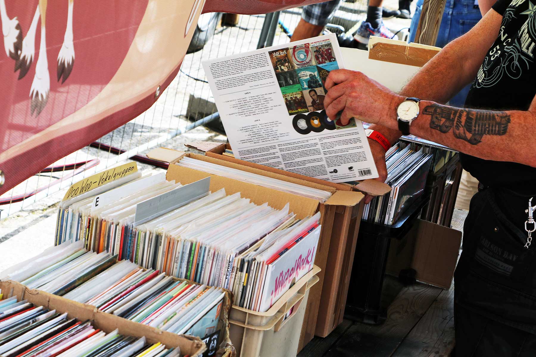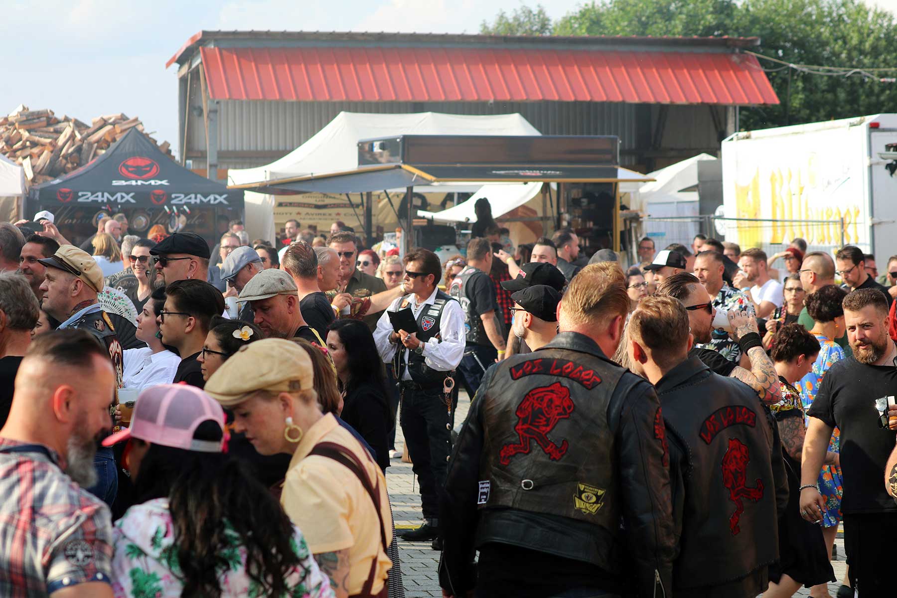 Dazu beigetragen haben auch die Verkaufsstände auf dem Festivalgelände. Pommade, Hawaii-Hemden, College-Jacken und Schallplatten – da gab es einiges an stilechtem Drumherum in der kleinen aber feinen Verkaufsviertelmeile. Dass das alles weniger als bei Hurricane, Rock am Ring und Co. ist, sollte allen klar sein. Das gilt auch fürs Essen. Allerdings sollten Vegetarier:innen sowie vor allem Veganer:innen lieber vorab ordentlich essen, sonst bleiben schnell nur noch Pommes (plus vegetarische Burritos) als Option für die zwei Tage übrig. Diesbezüglich sollte meiner Meinung nach nochmal nachgebessert werden, vielleicht haben wir mit unseren „jungen“ Jahren und Ansichten aber auch nicht komplett der eigentlichen Zielgruppe entsprochen, die noch in einer Fleisch-haltigeren Zeit aufgewachsen ist. Dass es Burger gab (wenn auch nur mit Fleisch), fand ich durchaus stilecht, persönlich hätte ich mir noch Hot Dogs als typischen 50s-Diner-Snack gewünscht.