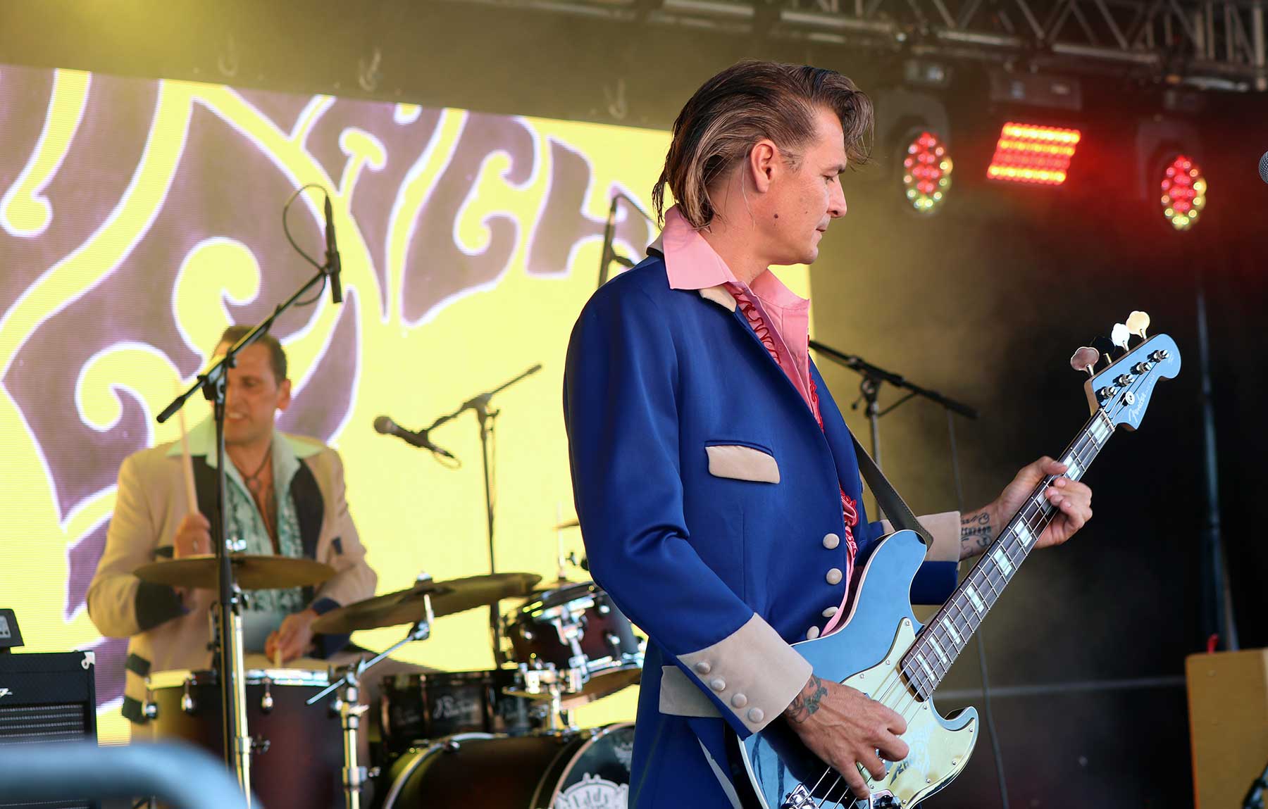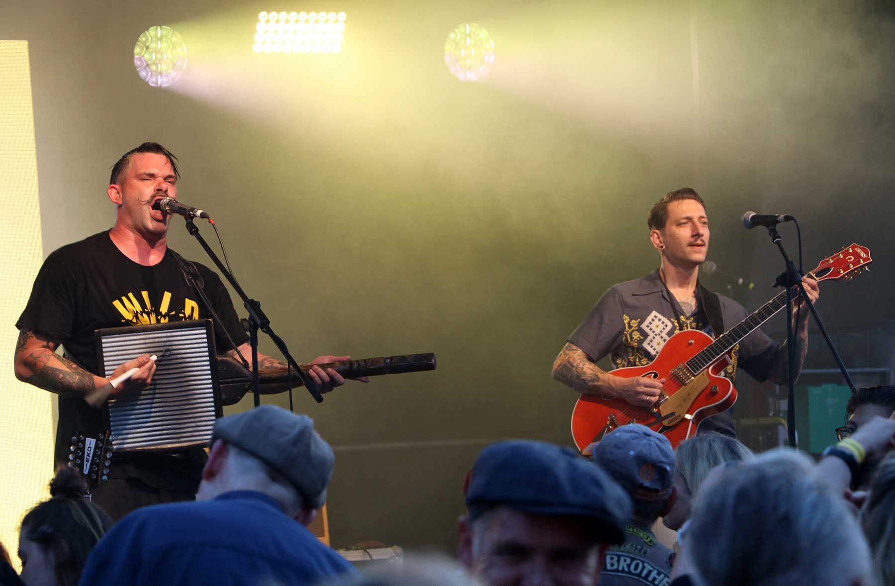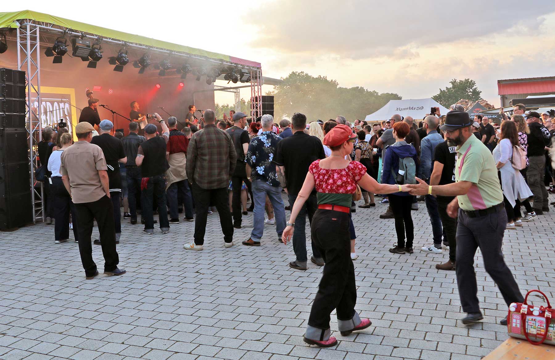 Das Festival war gut mit dem öffentlichen Nahverkehr von Hannover aus erreichbar und fand auf einem privaten Bauernhof statt. Am Freitagnachmittag begann das Line-up mit einem Auftritt von „Eddy and the Backfires“, der Band um Festival-Gründer und Sänger Ralf „Eddy“ Bergstedt. Das war musikalisch bereits große Klasse und meiner Meinung nach in den Top 3 der Auftritte. Aufgrund des Wochentages und dem Regenwetter, das erst pünktlich zum Auftakt aufgehört hatte, ließ das Publikum noch etwas auf sich warten. Aber so blieb mehr Platz vor der Bühne für spontane Tanzeinlagen – eine der vielen tollen Retro-Highlights, die es auf größeren Festivals selten in der Form zu sehen gibt.