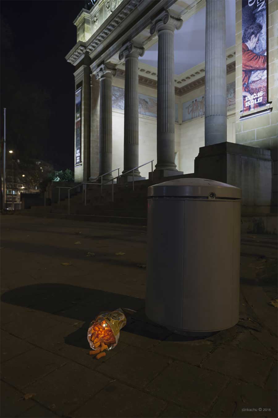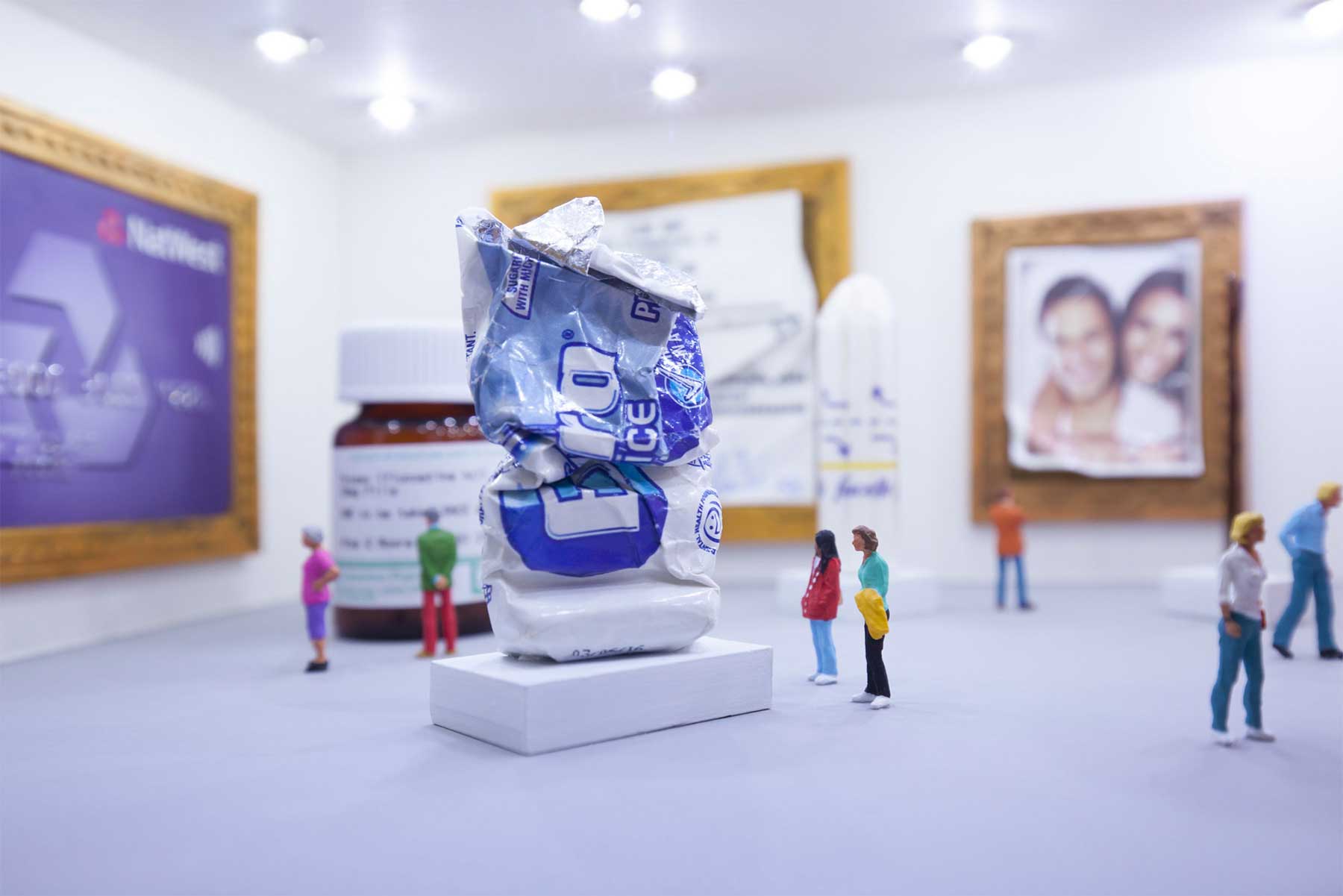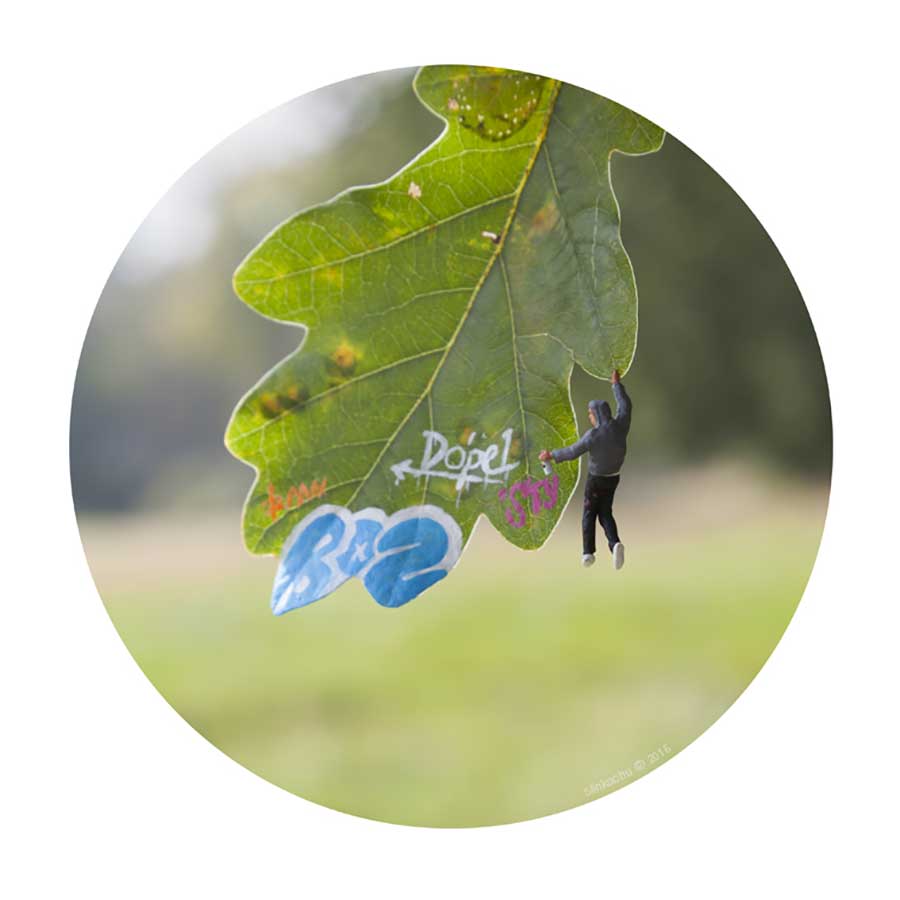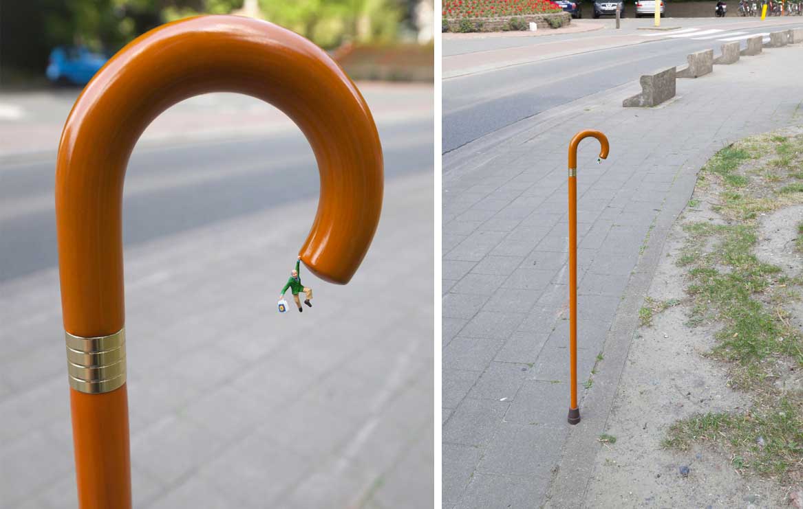 „I started working with miniatures in 2006. My work involves remodelling and painting of miniature model train set characters, which I then place and leave on the street. It is both sculpture, street art installation and photography. The street-based side of my work plays with the notion of surprise and I aim to encourage city-dwellers to be more aware of their surroundings. The scenes I set up, more evident through the photography and the titles I give these scenes, aim to reflect the loneliness and melancholy of living in a big city; the universal sense of being overlooked, lost and overwhelmed. But along side this there is always some humour in my works. The modern world can be a preposterous place to live and I encourage empathy with the tiny people struggling to get by.“ (Artist Statement)