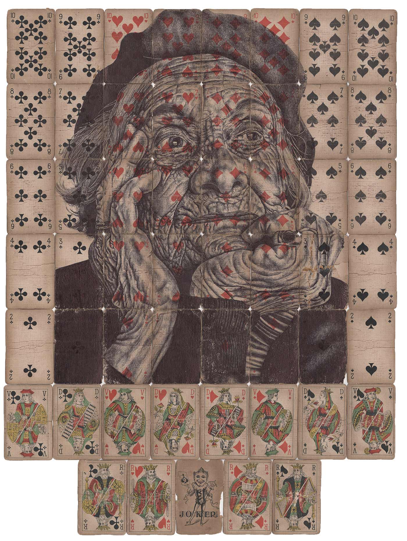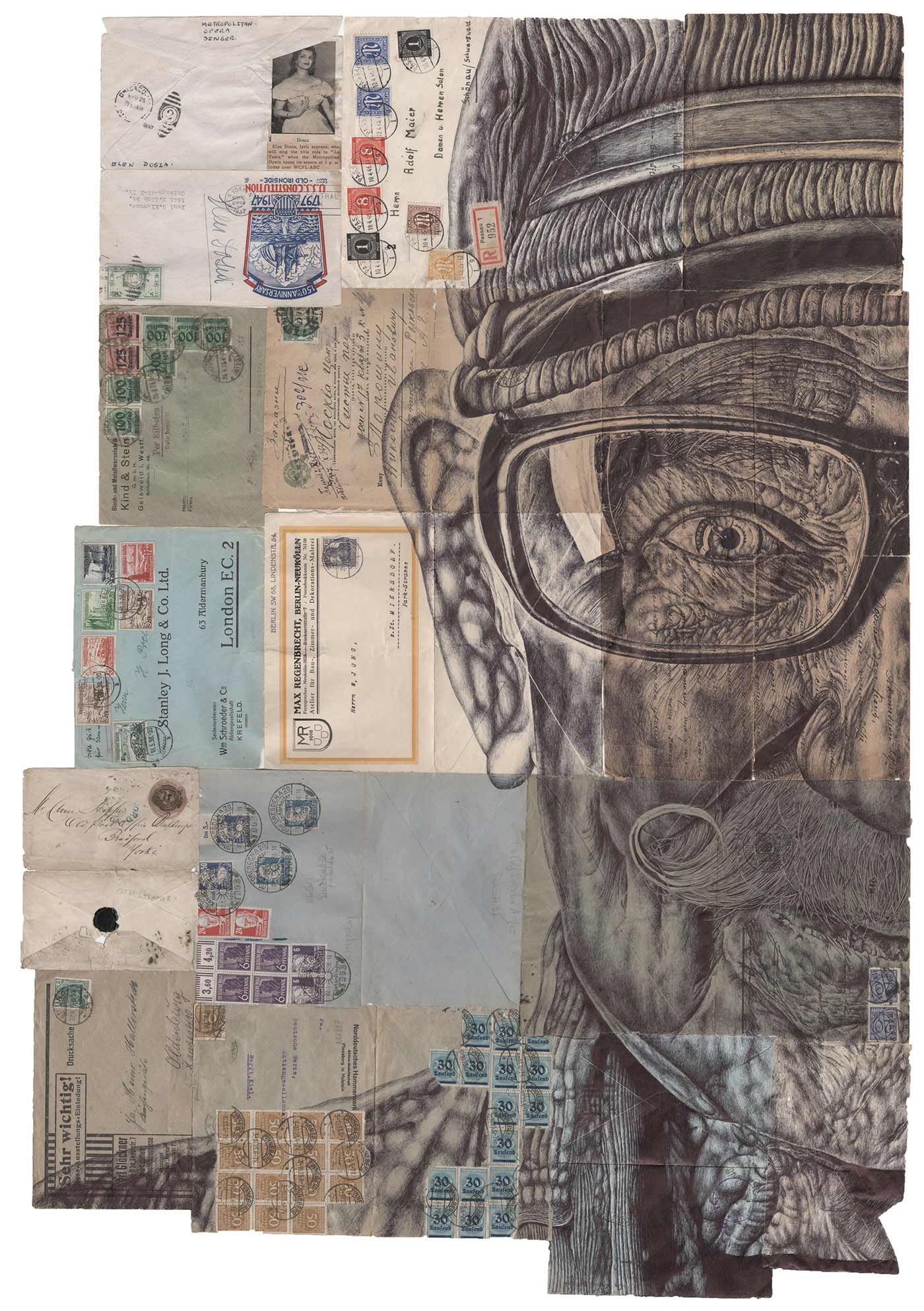 „After we were evicted from the warehouse in London, at which point i was painting large scale paintings, i had to work smaller. I had found an envelope that was sent from the trenches in World war one. The solider had sent it just before ‘going over the top’. With the likelihood that the solider never returned i decided to draw what he may have looked like as an old man. And so it started. In an increasingly digital age i want to save as much as i can in the way of maps etc and ‘upcycle’ them. The pairing of elderly people and antique documents is a natural one. Both have an untold history upon the face of it. A suggestion.“ (Artist Statement)
