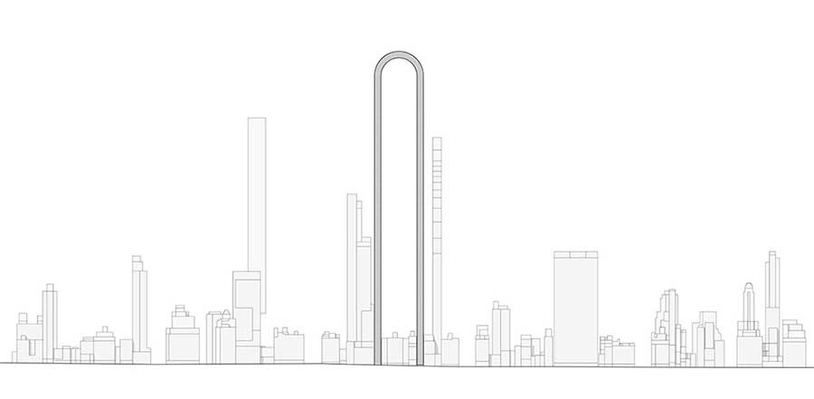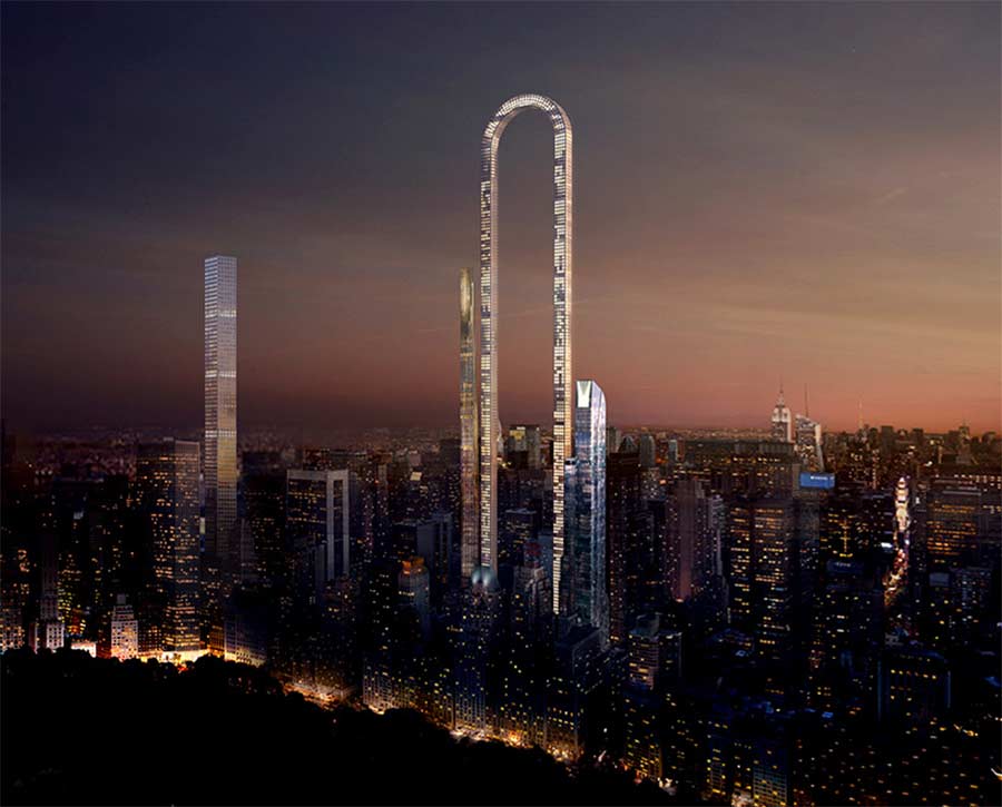 Öhm, okay. Noch ist nicht 1. April, oder? Knapp am Verarsche-Tag Nummer Eins vorbei (und dazu mit einem ungemein kalauerigen Namen) wurde „The Big Bend“ der Weltöffentlichkeit präsentiert. Das vom Architekturbüro oiio konzepierte Objekt erinnert schon sehr an die früheren „Twin Tower“ des World Trade Centers, nur dass sie eben oben verbunden sind. Und dank Umbiegung wird den dortigen Sicherheits-Gesetzen zum Trotz einfach mal das längste Gebäude der Welt geplant – passend zum Sensations-Protz an der „Billionaire’s Row“ (57. Straße) in Manhattan positioniert. Skurriles Ding. Noch ist unklar, ob und wann der große Bogen gespannt werden soll.