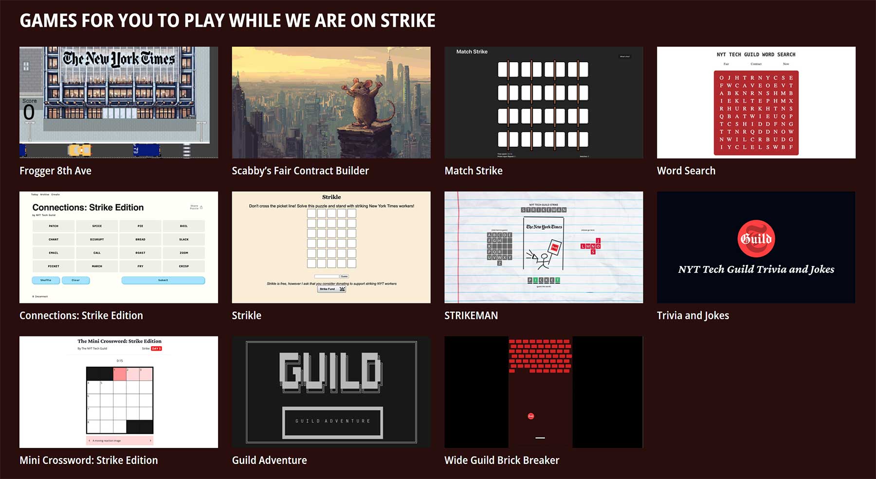 Anfang November hat die Tech-Abteilung der New York Times gestreikt. Nach acht Tagen niedergelegter Arbeit konnte man sich tariflich einigen und den Streik beenden. Neben fairerer Bezahlung für die Angestellten hat der Streik aber auch für uns etwas Positives: Die frei gewordene Zeit hat man nämlich genutzt, um eine Reihe Browserspiele zu entwickeln, die spielerisch mit dem Thema umgehen und zudem einige bekannte Spieletitel (wie z.B. „Frogger“ oder „Wordle“) persiflieren.