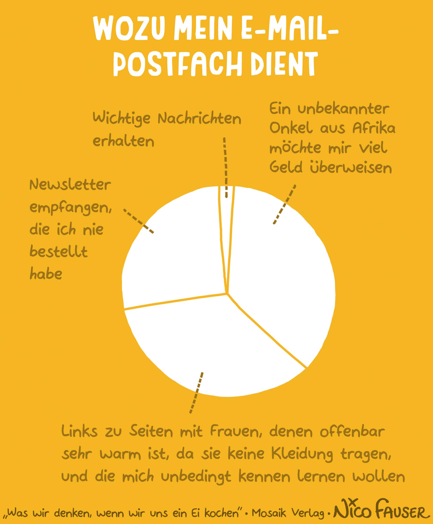 Cartoonist und Autor Nico Fauser hat mich angeschrieben und auf sein neues Buch „Was wir denken, wenn wir uns ein Ei kochen: Unser Leben in 250 Grafiken“ (Partnerlink) hingewiesen. Das ist dann zwar nicht alles neu und hier und da redundant, aber da sind tatsächlich einige schöne Alltagsbeobachtungen bei, die in origineller Art und Weise auf den Punkt und in ein Visual gebracht wurden. Hier einige meiner Favoriten (auf die ich Zugriff hatte, leider habe ich bisher nicht das ganze Buch gesehen).