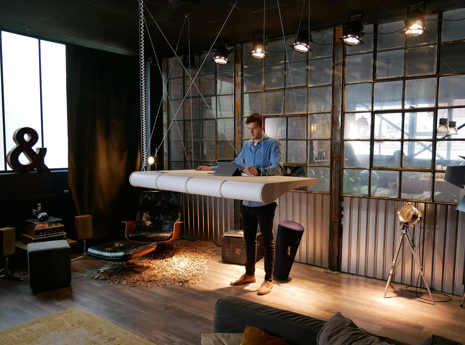 Dennoch finde ich die Idee des Jung-Unternehmens Floating Office klasse! Aber günstig ist der Spaß nicht. Noch gibt es auf Kickstarter zwei Early-Bird-Tische, die ihr für 2.990 Euro erwerben könnt. Danach könnt ihr ihn euch über das Crowdfunding immerhin für reduzierte 3.490 Euro sichern, später im Handel soll er mit einer UVP von 3.990 Euro stehen. Nichts als „kleines Gimmick“ zwischendurch und auch meinen sonst üblichen „Ist ja bald Weihnachten…“-Spruch kann man sich hier vermutlich sparen. Aber wer eh mit der Überlegung spielt, einen teuren neuen Schreibtisch zu kaufen – vielleicht ist der hier ja passend? Hohe Decken von Vorteil.