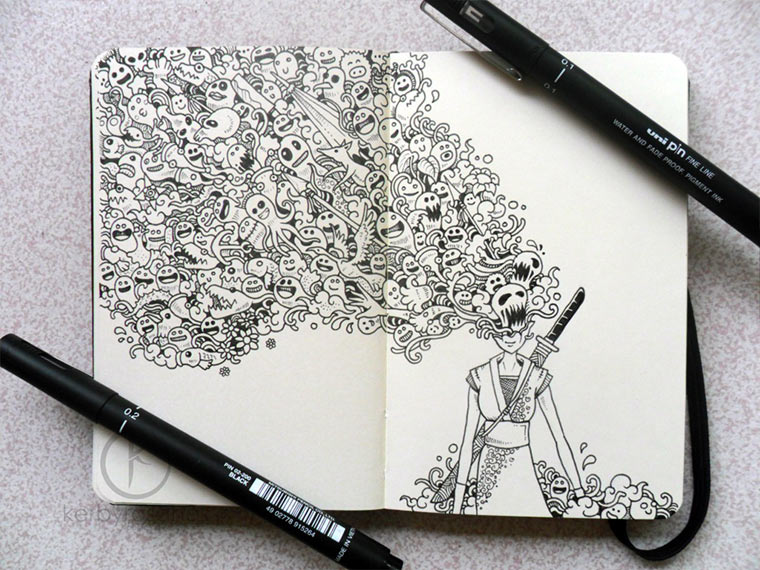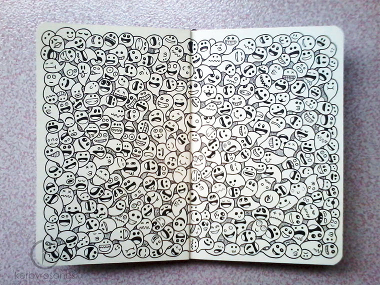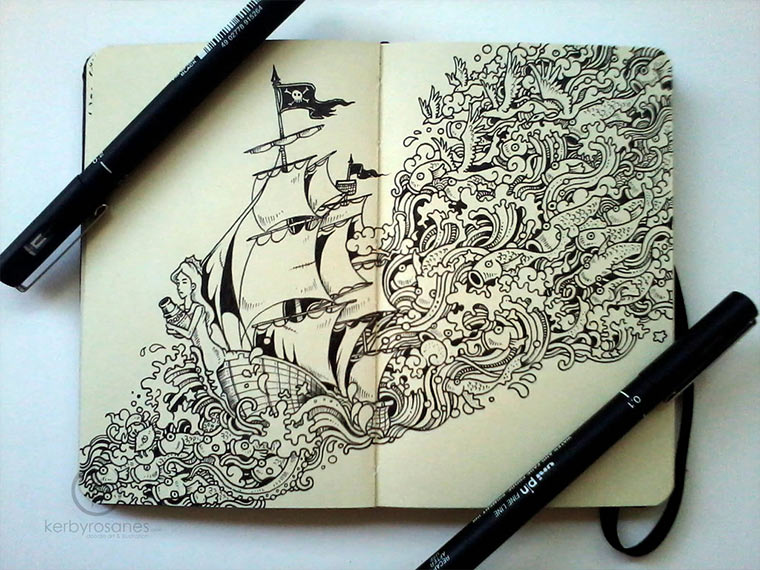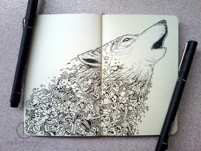 Kerby Rosanes von den Philippinen arbeitet als freischaffender Illustrator. Nebenbei erstellt er feine Illustrationen auf Moleskins, also Notizbüchern. Während unsereins ein paar Kreise und Formen während des Telefonats oder dem langweiligen Vortrag kritzelt, schafft Rosanes wahre kleine Kunstwerke. Mir gefällt vor allem der in sich konsistente und robuste Stil.