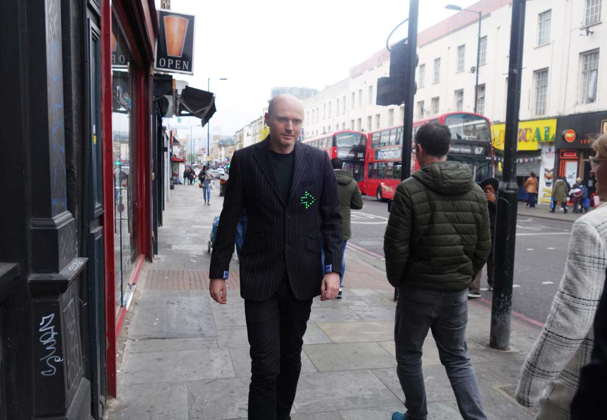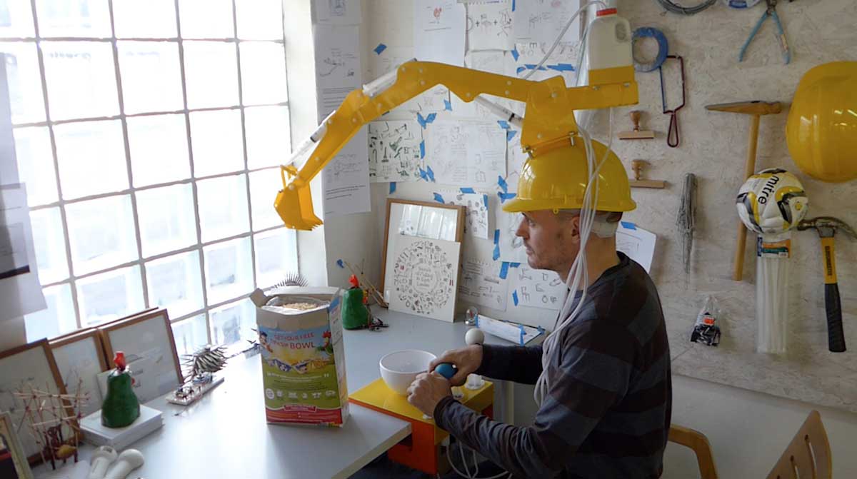 Ansonsten hätten wir da unter anderem noch ein Jackett, mit dem man Passanten angeben kann, auf welcher Seite sie passieren sollen, damit dieser ominöse Links-Rechts-Tanz nicht stattfinden muss. Oder einen Cornflakes-Baggerarm-Helm. Oder ein Bauchgrummel-Verstärker. Ihr merkt, bei Dominic Wilcox ist viel Skurriles geboten!