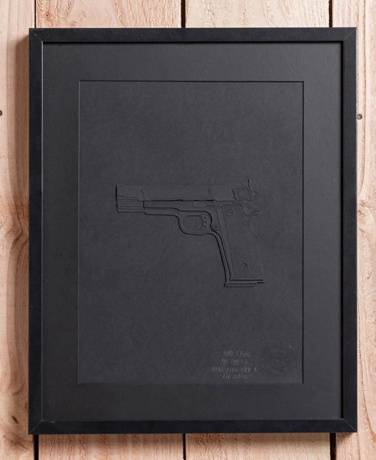 Der französische Illustrator Neur Öne aka Neur1 hat sich dem Papier nicht nur als Grundlage seiner gemalten Werke vermacht. Einige seiner Motive bestehen ausschließlich aus Papier. In mehreren Schichten gekonnt angebracht, so dass ein 3D-artiges Bild entsteht, das aus der Wand heraus zu brechen scheint. Leider hat er sich da vor allem Handfeuerwaffen ausgesucht, dabei bieten gerade die Portraits und Fahrzeuge so viel mehr!