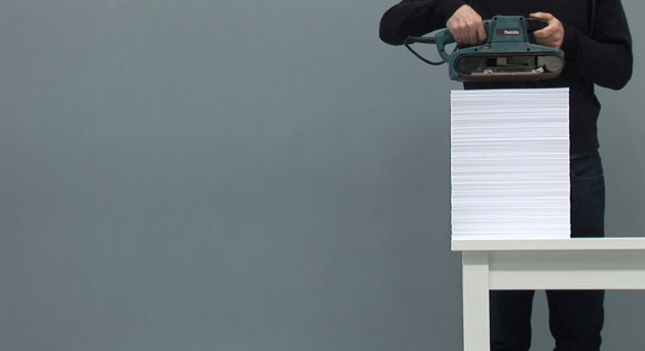 John Wood und Paul Harrison zeigen uns in ihrer Live-Skulptur One more kilometre, wie man mit dem anfallenden Papierkram vor dem Wochenende effektiv fertig wird: Einfach die Schleifmaschine zur Hand nehmen. Ist schnell und sieht auch noch gut aus.