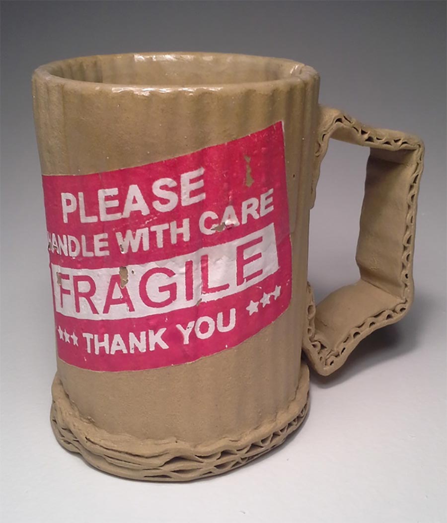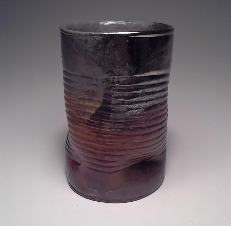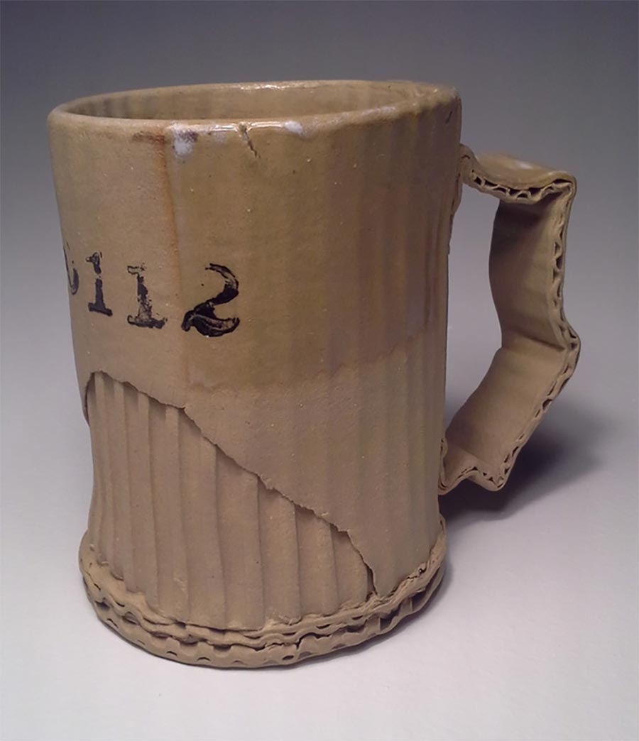 Vor Ewigkeiten habe ich mir mal so kleine Kermamik-Becher geholt, die so geformt waren, als seien sie zerdrückte Plastikbecher. Das fand ich sehr toll. Daher bin ich auch durchaus Fan der Arbeiten von Tim Kowalczyk. Der Keramiklehrer will nämlich, dass niemand sieht, dass seine Werke aus gebranntem Ton sind. So lässt er sie durch smartes Formen und Bemalen wie alte Pappe erscheinen. Oder altes Aluminium. Hauptsache alt und eben keine Keramik…