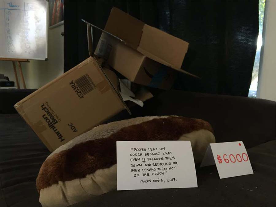 „Based out of my home in Hollywood, CA, my passive-aggressive art gallery, which spotlights ignorance of basic responsibility and courtesy for others in shared spaces, has been thriving, although some critics don’t care for my emphasis on found pieces.“