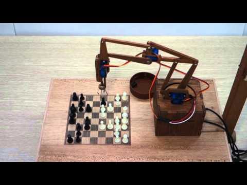 „Hello, this is one of my Arduino-projects – ChessBot, chess-playing robot. His brain is an Android-smartphone, that sees the chessboard, analyzes position and sends this info about move to the robot via bluetooth. This manipulator works with Arduino Leonardo and with 4 servos Tower Pro SG-90. You can ask some questions in comments, i’ll try to answer on some of them. I don’t want do tutorial about this project, because it’s very difficult to replicate it. Sorry for my english, it’s not my mother-tongue.“