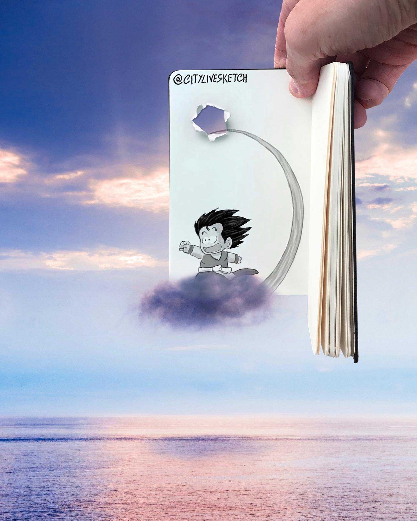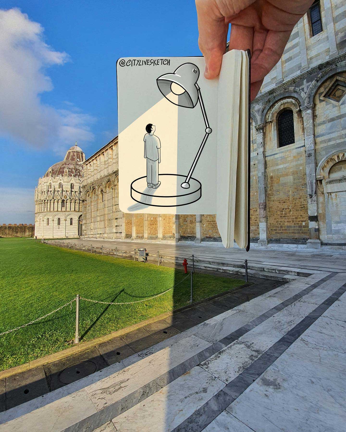 Weitere dieser CityLiveSketches lassen sich auf dem Blog von Pietro Cataudella finden, sowie auf seinen Social-Media-Profilen bei Instagram (@citylivesketch) und Facebook. Neben der eigentlichen Idee und teilweise sehr genialen Umsetzung gefällt mir vor allem auch, dass es ordentlich Abwechslung zu sehen gibt. Und nein, damit meine ich nicht (nur), aus welchem Bildrand der Arm samt Notizbuch eingeflogen kommt… Nein, er geht auch immer origineller mit den jeweiligen Bild-Hintergründen um, statt einfach „nur“ ein Abbild des zu Sehenden davor zu halten. Er interagiert auf kreative Art und Weise mit der Umwelt und bastelt auch immer wieder im Nachgang am Computer auf digitalen Ebenen herum.