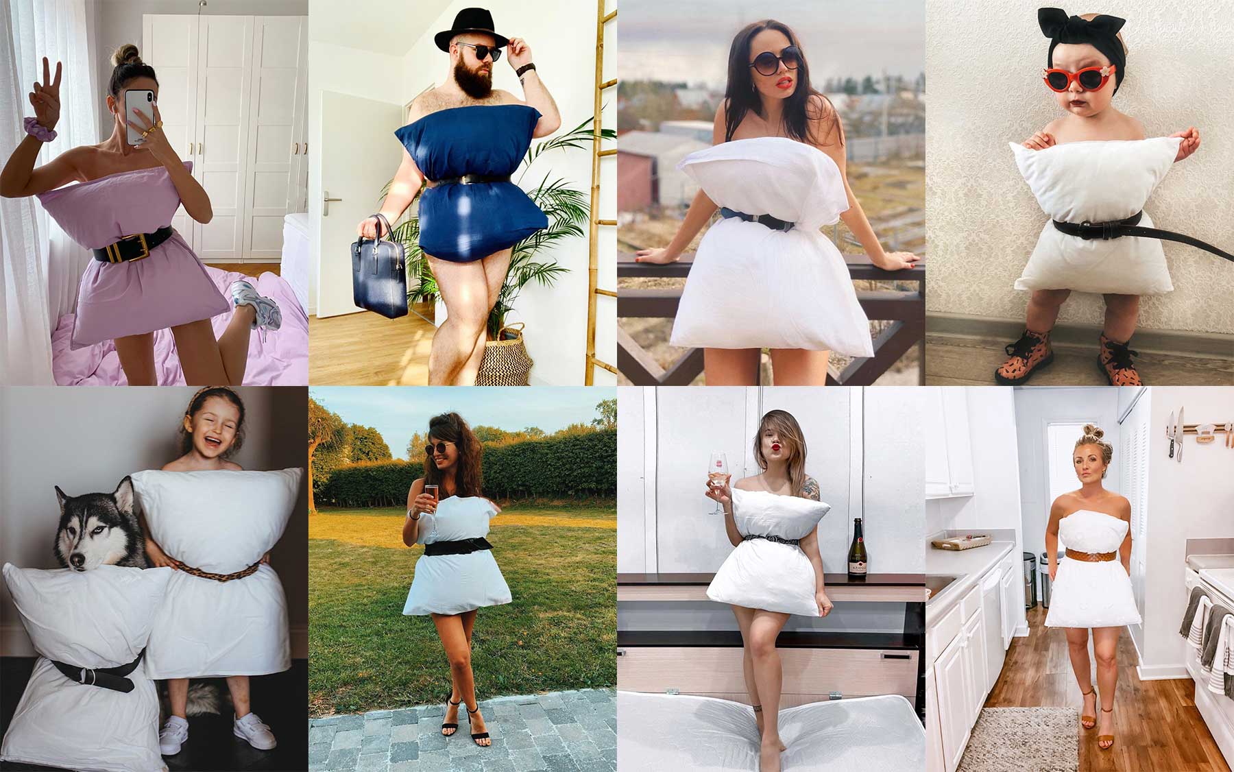 Angeblich sollen @myforteisfashion und @stylebynelli den Trend im April losgestoßen zu haben. Mittlerweile sind etliche nacheifernde Bilder von Menschen und Tieren mit Kissenpracht unter zum Beispiel den Hashtags #pillowchallenge, #quarantinepillowchallenge, #pillowdress oder #pillowdresschallenge zu finden. Man könnte meinen, dass die Hashtags abwechslungsreiche als die dargestellte „Mode“ bei dieser kreativen Challenge sind…
