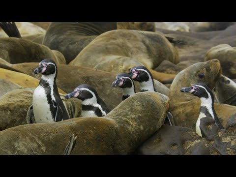 „To get to the sea, these Humboldt penguins have to squeeze through a rowdy crowd of Sea Lions… which proves to be tricky.“