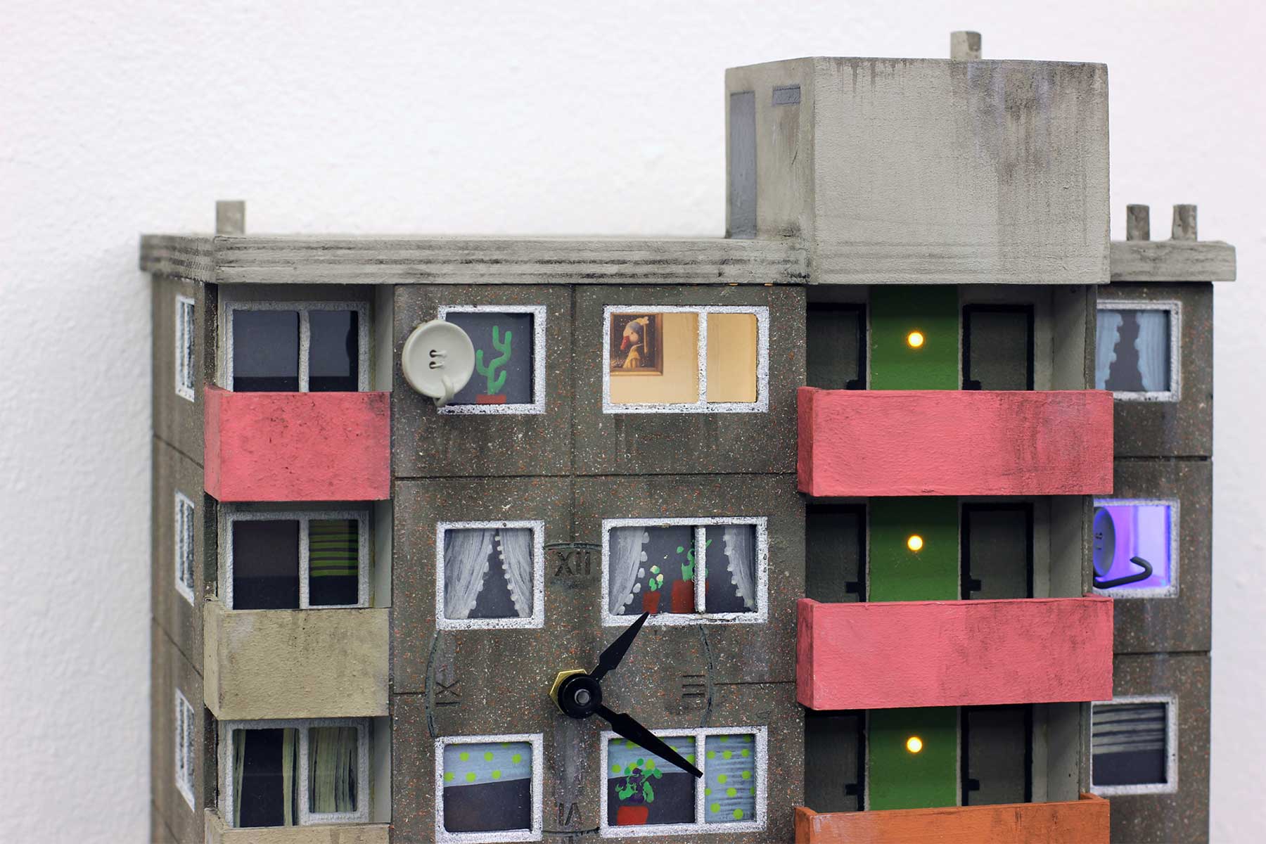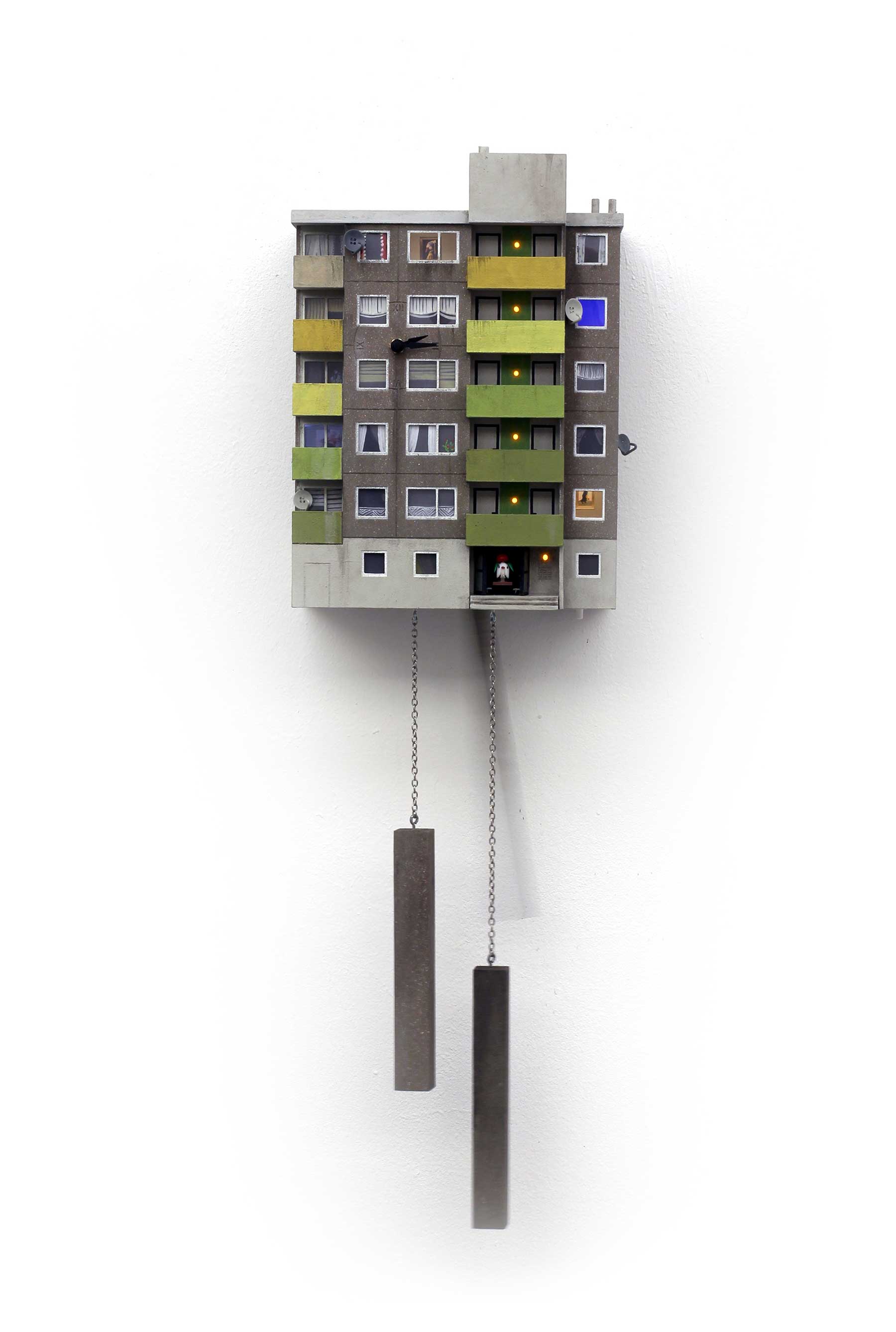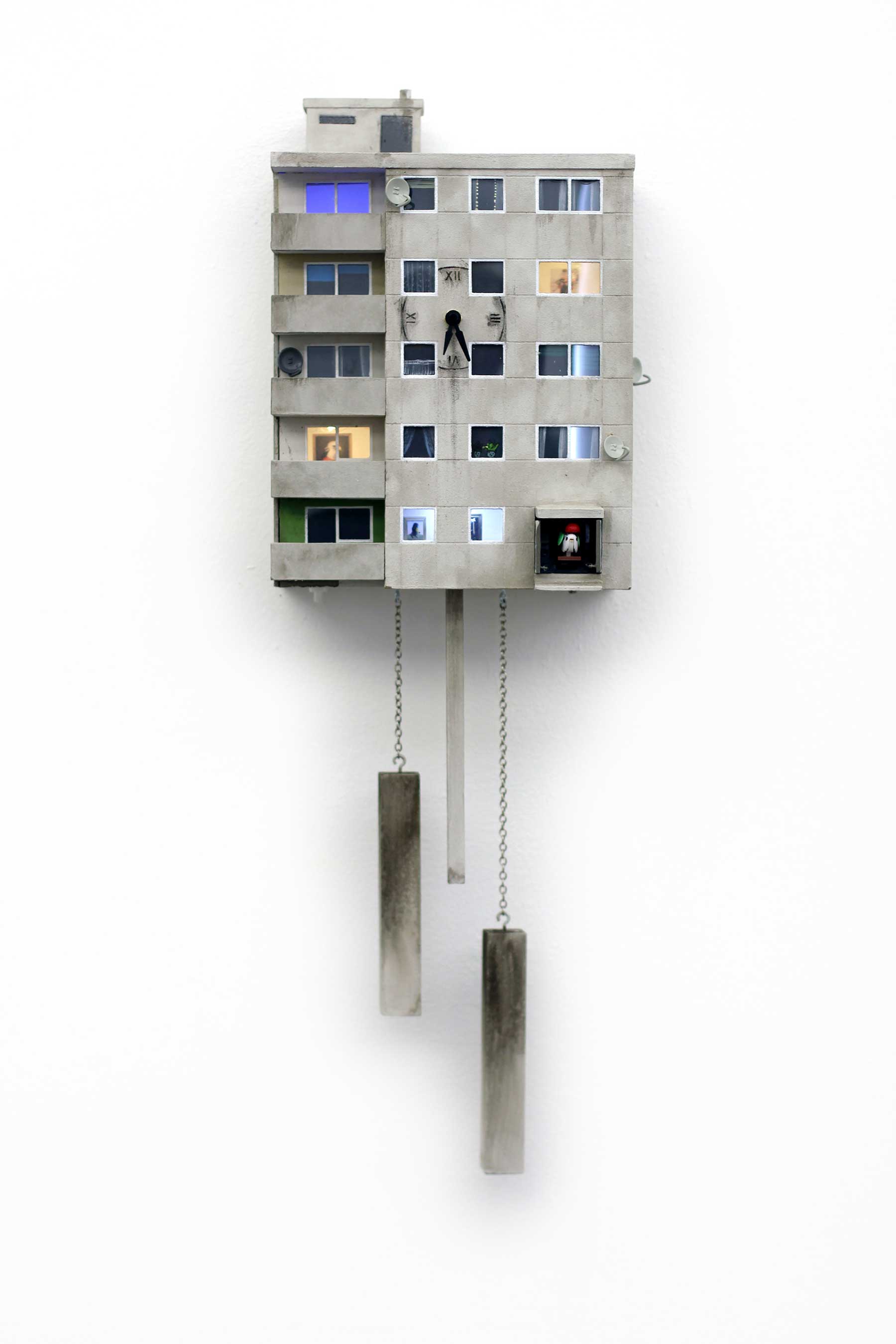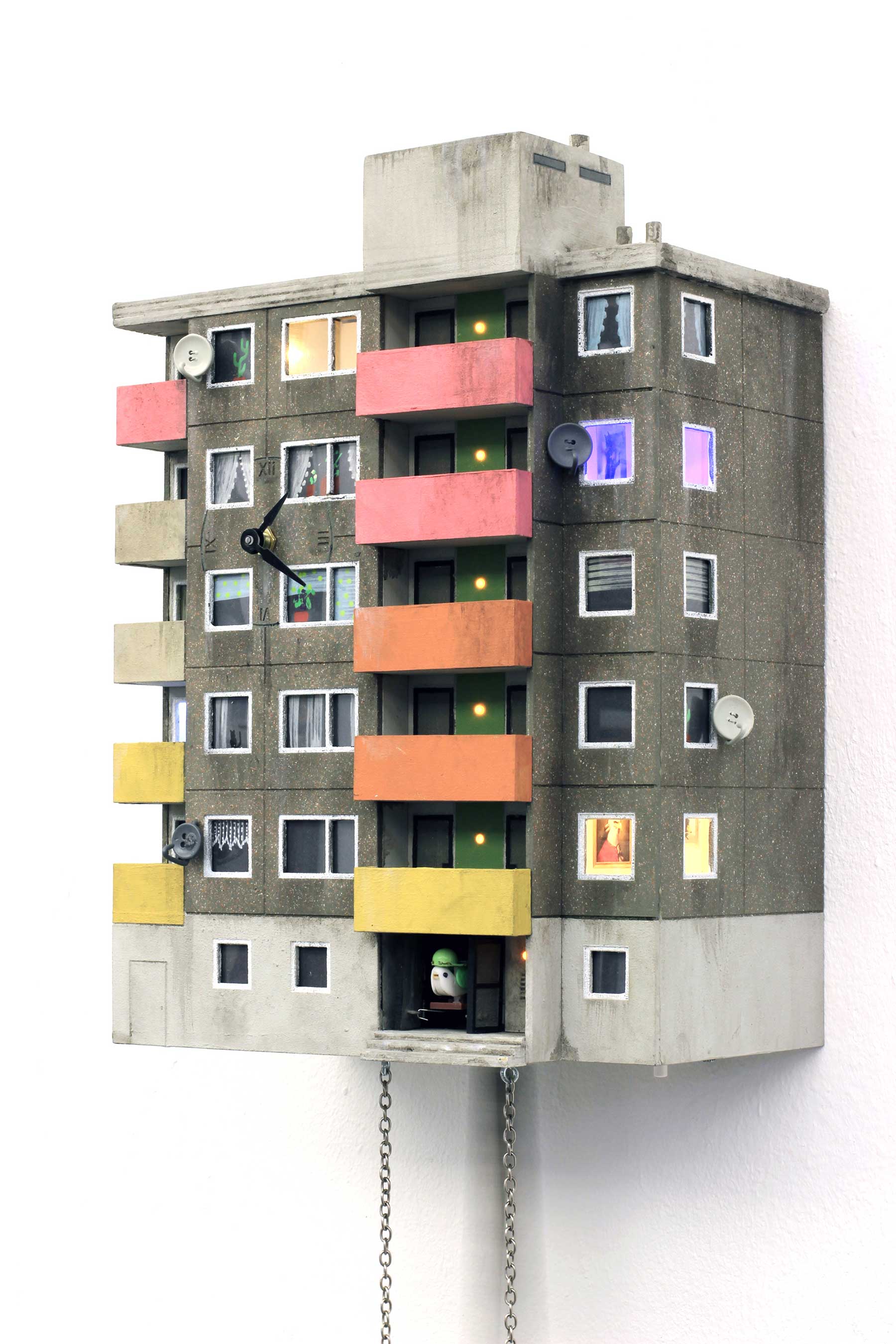 „Die Hülle ist neu, aber die Seele, ein Uhrwerk mit Kuckuck, ist noch die alte. […] Die klassische Kuckucksuhr steht für den Wohlstand der Mittelschicht und zählt als eine Art Luxusgut für das biedere Heim. Die aktualisierte Version als Plattenbau zeigt das heutige urbane und soziale Leben in Wohnblocks.“ (Projektbeschreibung)