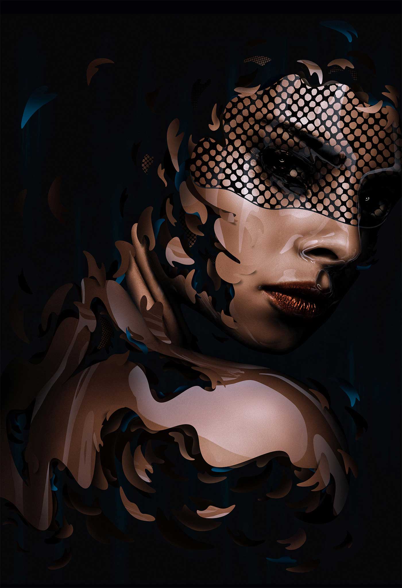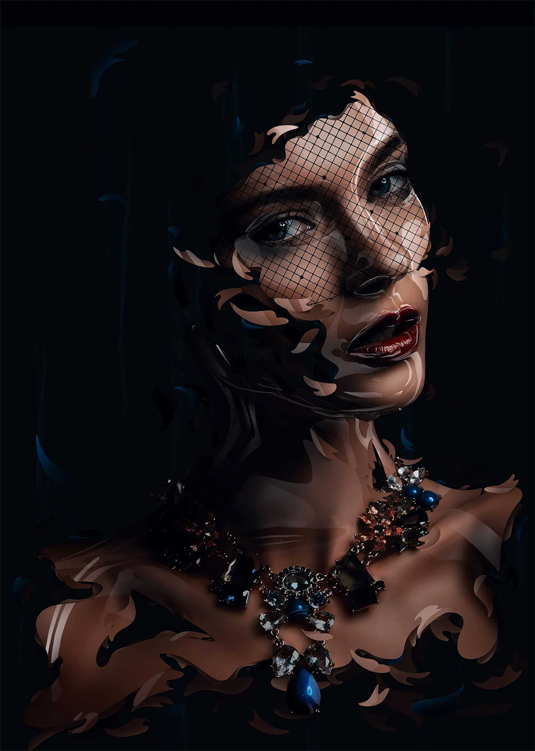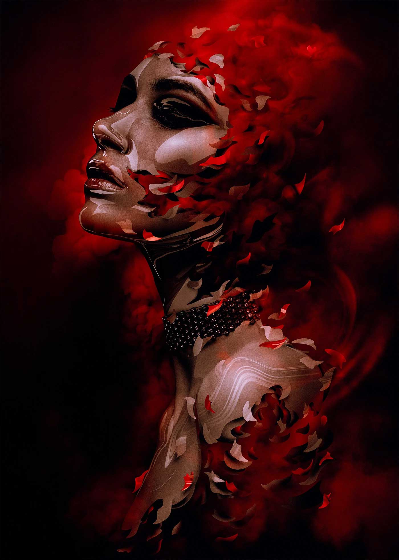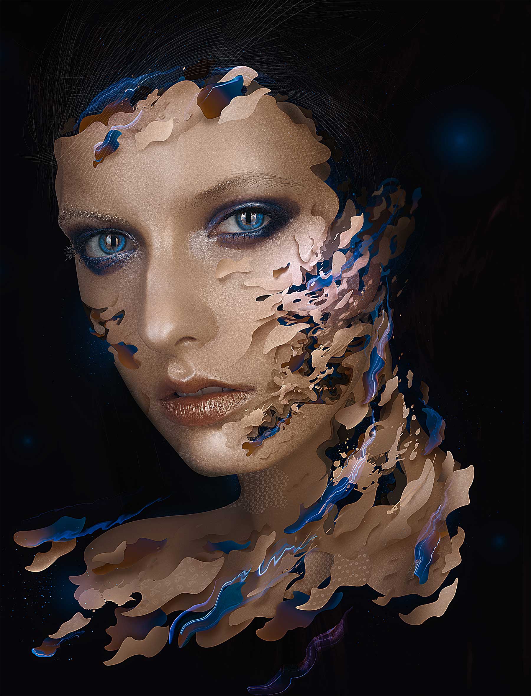 „I’m creating art pieces by using a variety of styles, different techniques, and various software. One of the main genres is ‚Porcelain Dollz‘. Specifically for these works I have completed the courses for retouching and make-up art. Also experienced in using effects that require no digital graphics (practical effect). My works have been published in different magazines and took part in exhibitions around the world. I am fascinated by lines and forms. In my every creation I strive for lines that compliment the face of the person and every work is full of form. And of course, such work requires color that captivates the eye with the playful game of shades.“ (Artist Statement)