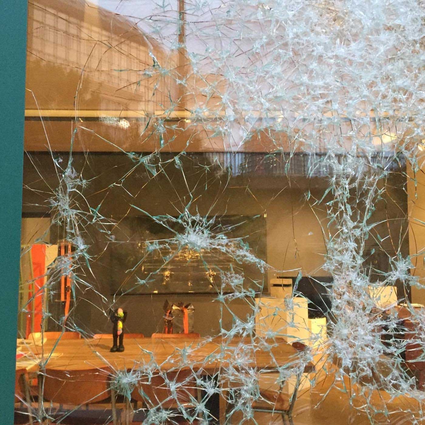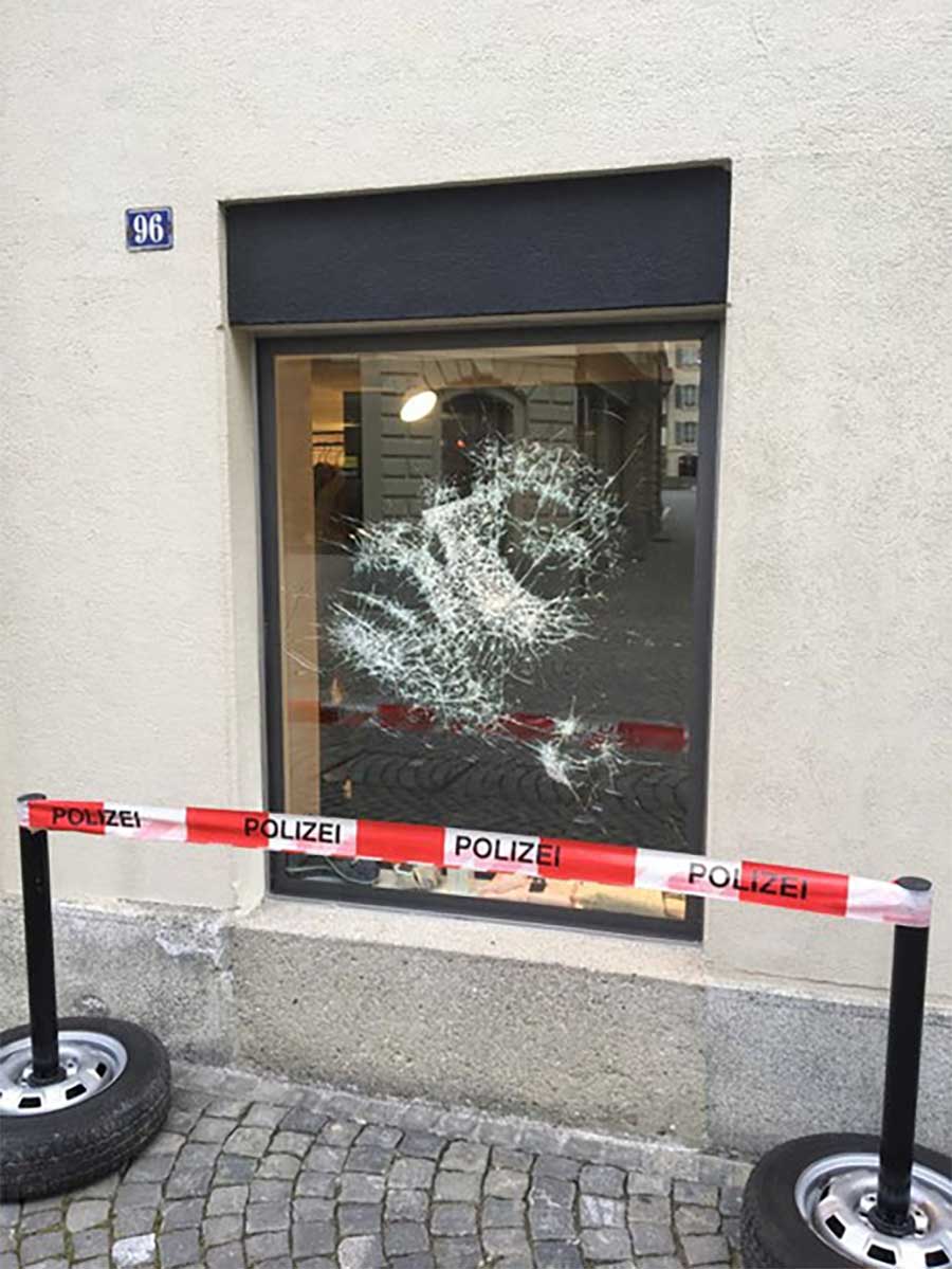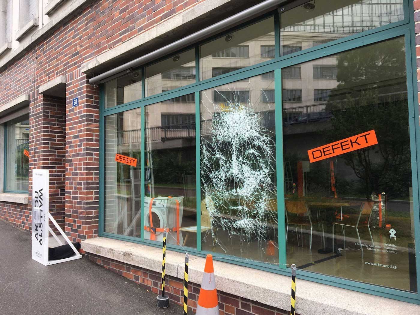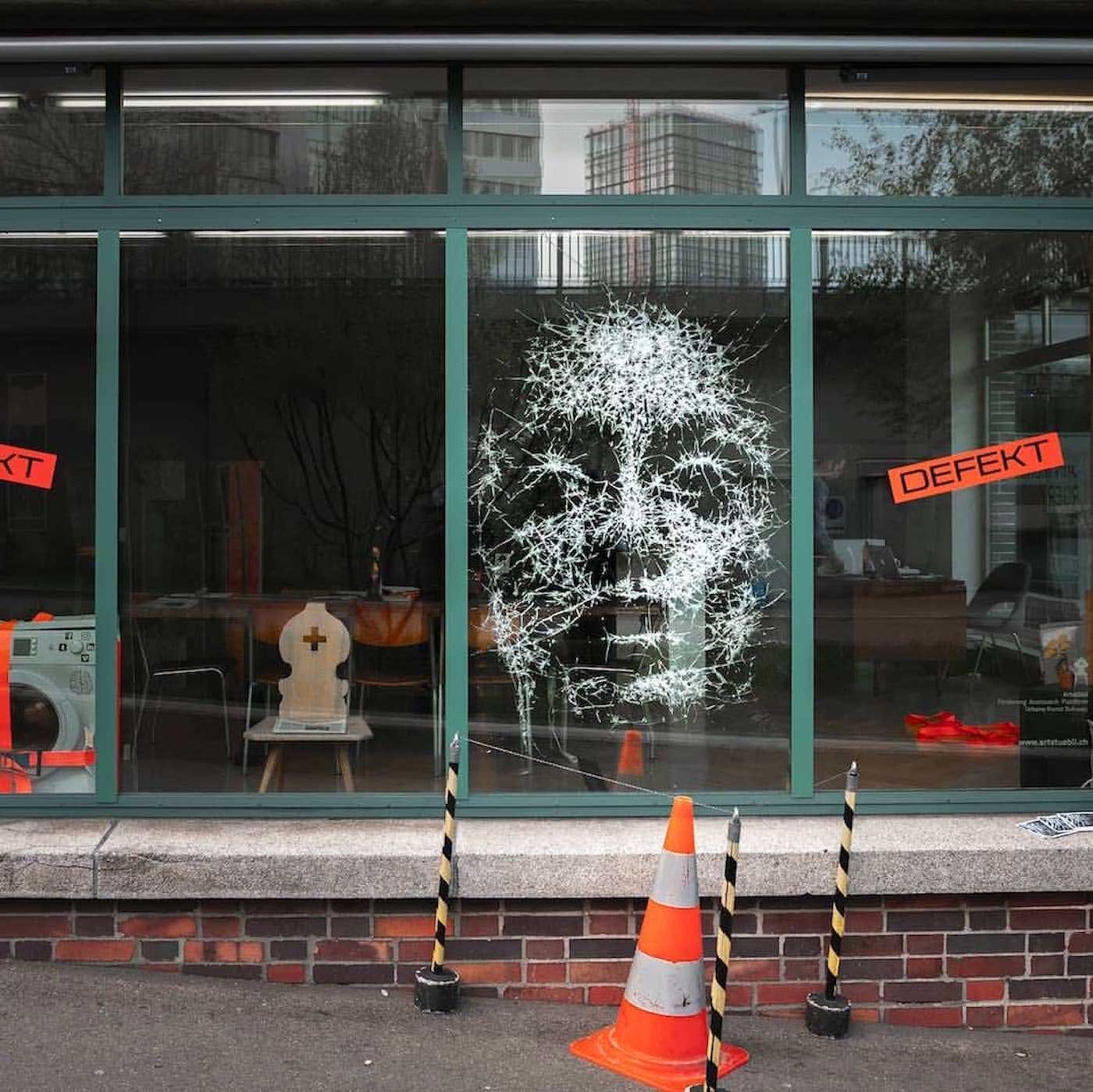 Glas ist zwar durchaus als künstlerische Werkstoff bekannt, aber eher, was die Ausformung oder mosaikhafte Zusammensetzung anbetrifft. Der Schweizer Künstler Simon Berger hat dem Artstuebli eine wahrhaftige „Summer Break“ geschaffen, indem er das dortige Schaufenster zerstört hat. Aber eben mit Bedacht und Vorsicht, so dass mit etwas Abstand das Portrait einer Frau erscheint. Kunst mit Kante, gefällt mir!