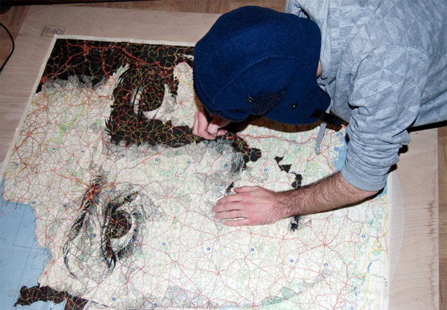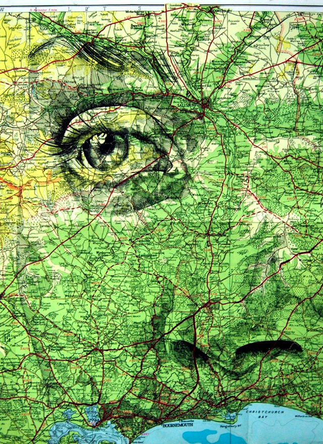 Ed Fairburn aus England bemalt Landkarten. Aber dies tut er nicht wahllos, er erschafft fantastische Portrais.
