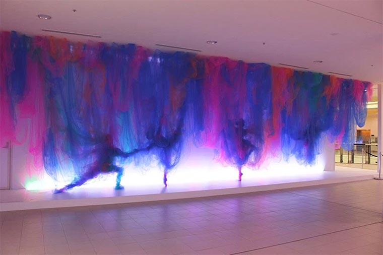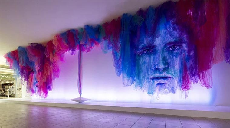 Der australische Künstler malt mit Tüchern. Quasi. Genauer gesagt mit Tüll. Ihr wisst schon, diesem ultra-dünnen Stoff, durch den man fast durchsehen kann. Aber eben nur fast. Durch smartes Legen und Hängen und Anrichten schafft Shine es, dass auch einer bestimmten Perspektive Formen und Gesichter erscheinen. Das muss ungemein aufwendig sein…