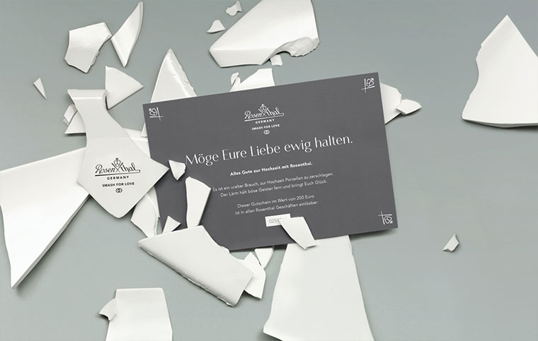 „Rosenthal, einer der weltweit führenden Porzellanhersteller, suchte für das klassische Hochzeitsgeschenk, den Porzellangutschein, ein ungewöhnliches und hochwertiges Design. Die Lösung: der erste Geschenkumschlag aus 100% Porzellan.“