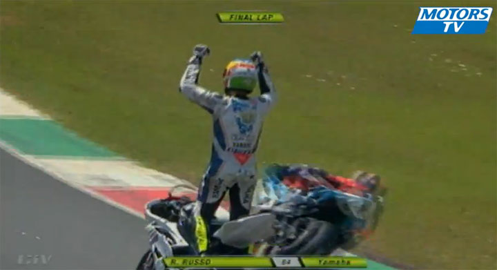 Schluss ist, wenn der Schiri abpfeift. Das hätte man Motorradrennfahrer Riccardo Russo mal eintrichtern sollen. Denn der freut sich, dass er als erster über die Ziellinie gefahren ist. An sich okay, aber die Grafik zeigt dummer Weise „final lap“ an. Ooops…