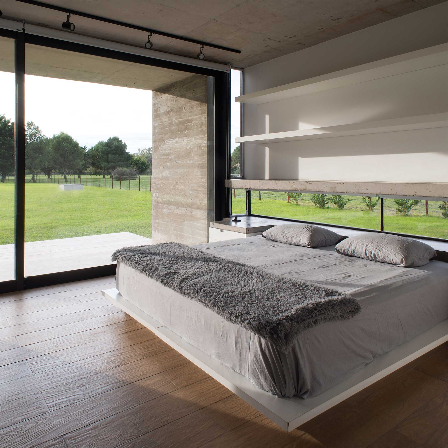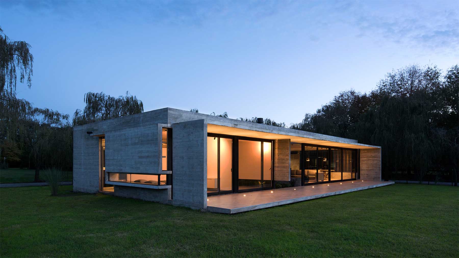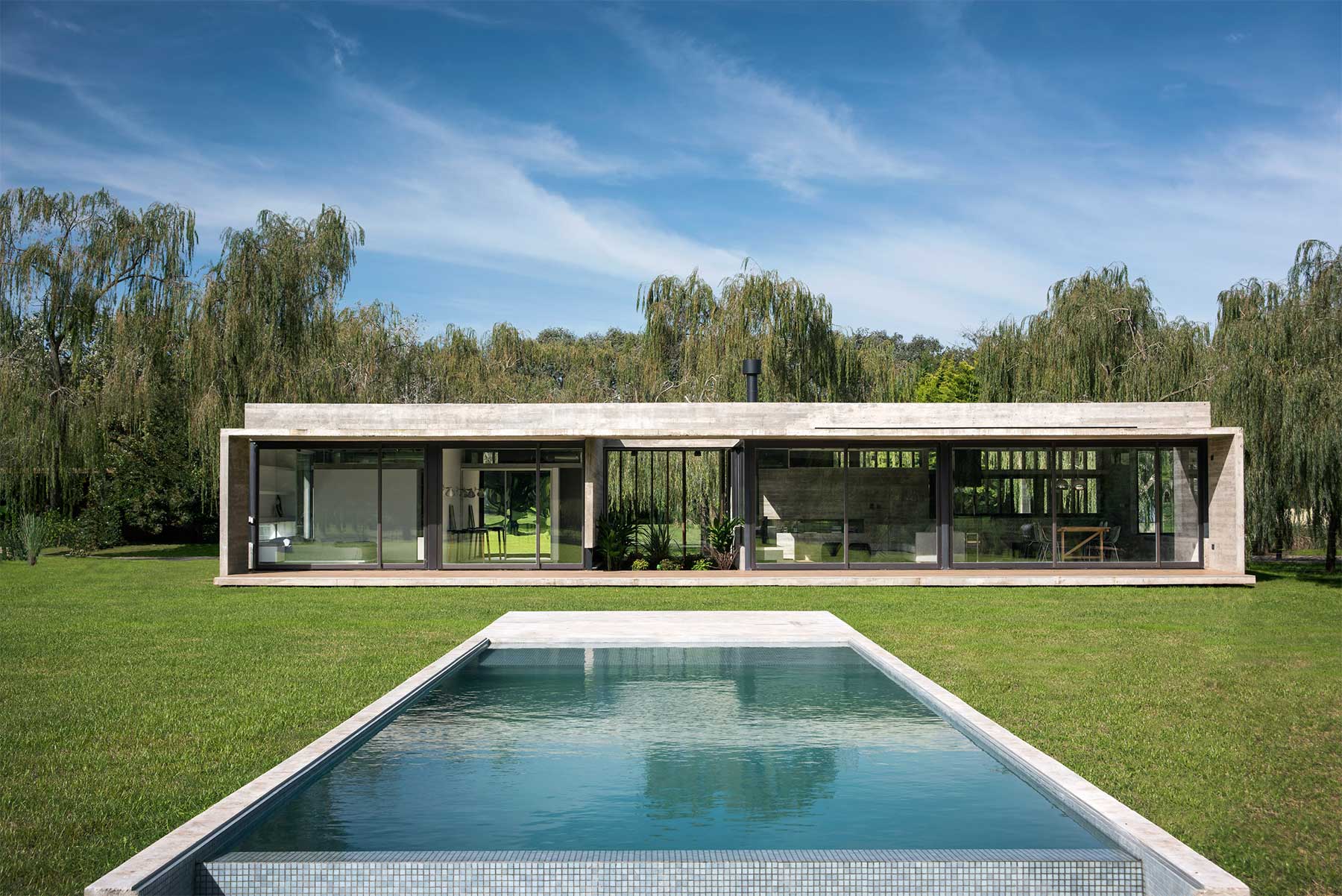 „This commission was made by a young couple with no kids that wanted to build their permanent residence. They asked for a house with a pure external image and an uncomplicated inner distribution. A single floor needed to accommodate a master suite and a second bedroom sharing a bathroom with a completely integrated social area. They also requested a project for a future enlargement in view of the possibility to include a third bedroom. The house was designed as a pure volume. Taking into account regulatory setbacks and keeping in mind a future expansion, the built area took up the lot’s whole width. A platform made out of concrete allows one to walk over a reflecting pool and reach a semi-covered reception hall. Right across the door, the first thing that comes into sight is a leafy inner patio just behind a glass panel. This patio arouses the senses as it allows views that go to the back of the lot.“