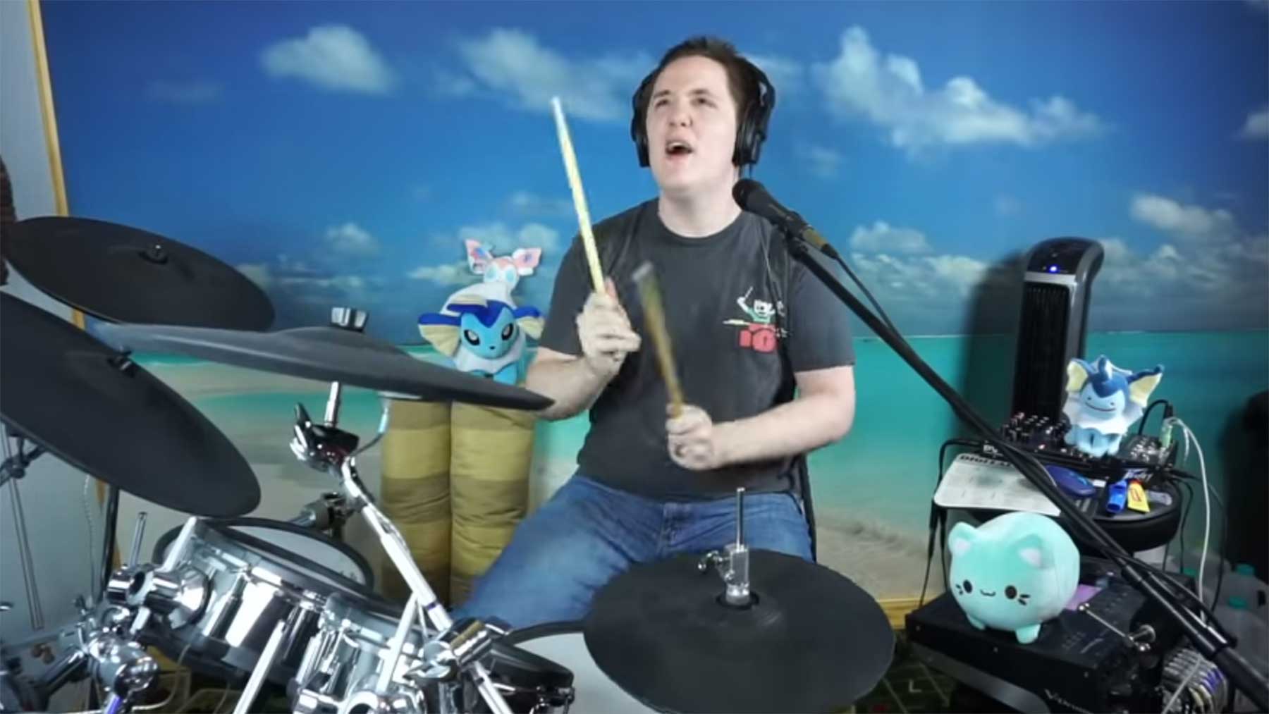Diese YouTube-Videos, in denen Songs (oder auch Filme) bei gewissen Schlagwörtern beschleunigt werden, sind jetzt nichts Neues, aber The8BitDrummer hat sich die und der Aufgabe gestellt, das nebenbei mit dem Schlagzeug zu begleiten – und kommt dabei gehörig ins Schwitzen!