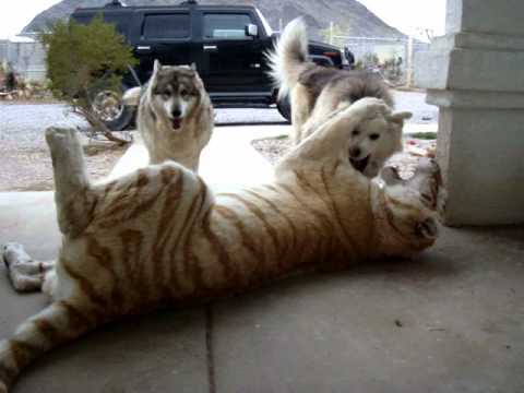 Immer Katze und Hunde. Dieses primitive Internet. Doch nein, hier gibt es Schmusereien für richtige Draufgänger: Ein Tiger schmust (leider nicht mit zwei Wölfen, was über-awesome gewesen wäre, sondern) mit zwei Hunden. Die sind nämlich dicke Freunde, da sie allesamt zusammen aufgewachsen sind. Nur ist die Mietze für die Hunde unerwartet groß geworden…