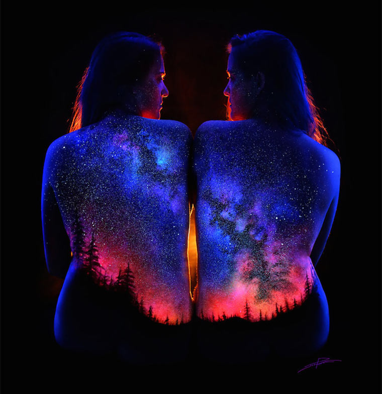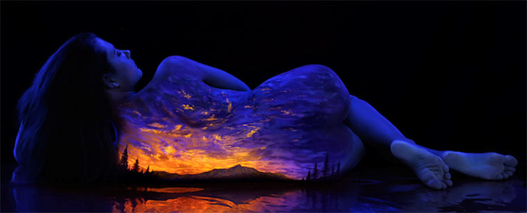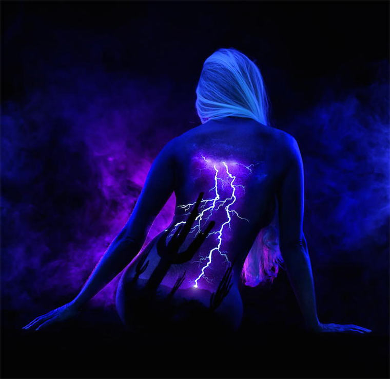 Künstler und Fotograf John Poppleton vereinigt gerne beide Tätigkeiten in einem Projekt. Seine Reihe Black Light Bodyscapes zeigt uns die nackten Rückenpartien junger Damen, die mit UV-Farbe besprüht worden sind. Unter entsprechendem Schwarzlicht-Einsatz ergeben sich sehr besondere Anblicke.