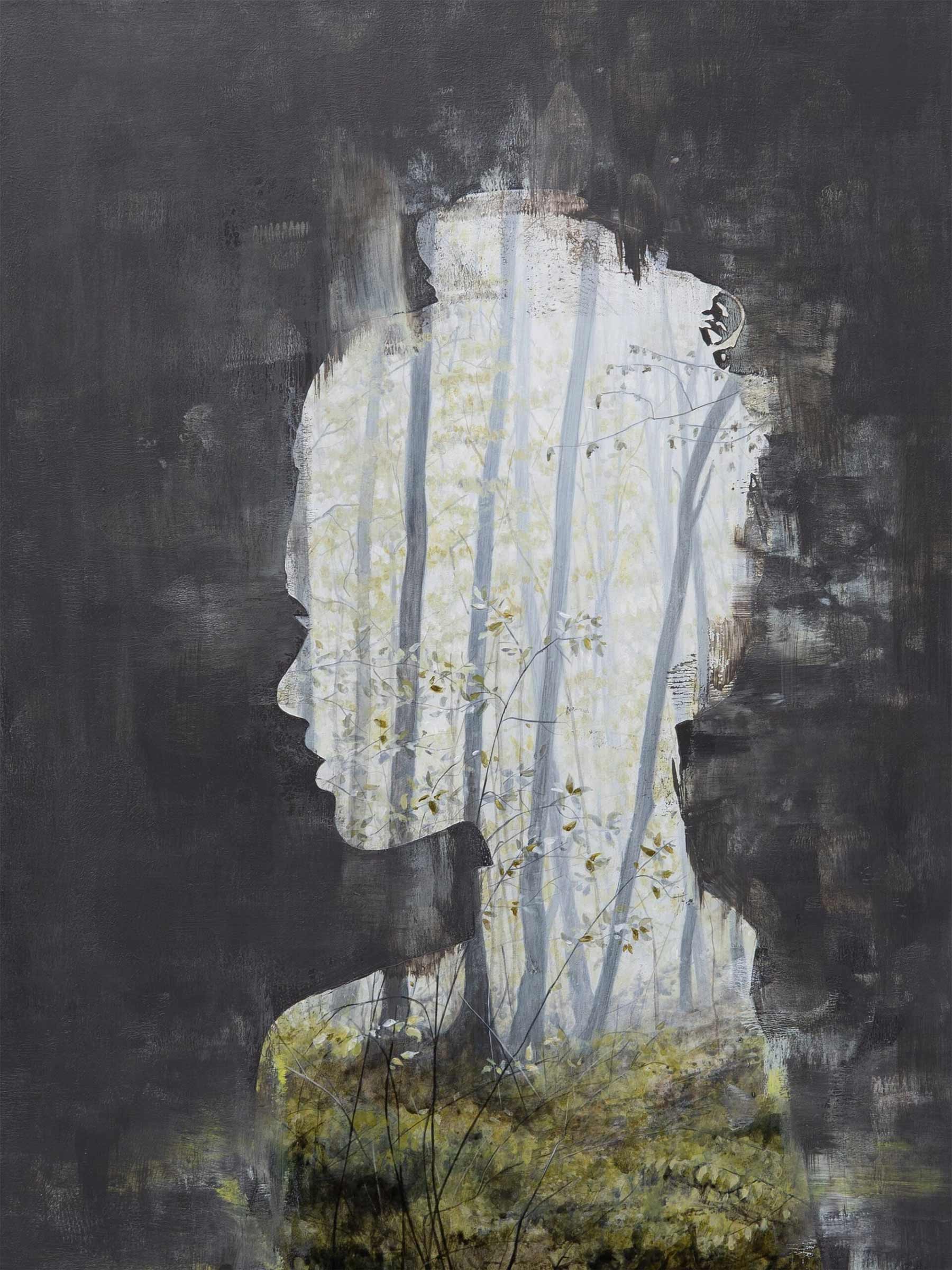Interesante Technik. Ich hätte gedacht, dass Megan Aline erst ein komplettes Waldmotiv auf ihren Holzplatten malt, um dann jene Teile zu übermalen, die nicht zur Silhouette der gezeigten Person gehören. Aber nein, sie klebt die Flächen entsprechend vorher ab, so dass nach dem Übermalen mit den natürlichen Strukturen eben jene abgezogen werden und die klare Kante der Form zum Vorschein kommt. Letztlich ist ja auch egal, wie die Gemälde entstehen, fest steht, dass sie sehr schön anzusehen sind und an den Double Exposure Effekt in der Fotografie erinnern.