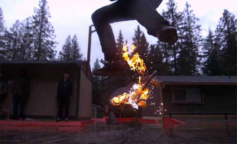 „Heya! Dudes, I’m so excited about today’s video. Seriously it has been a LONG time in my idea book to get skateboarders doing crazy stuff on fire in the rain.“