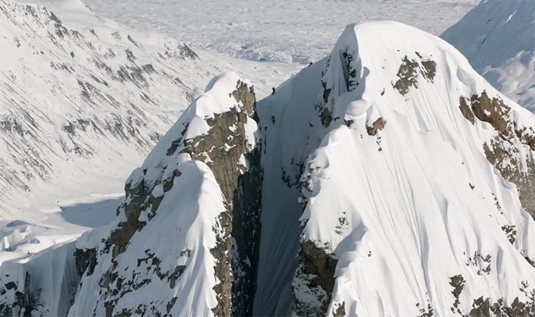 Ich könnte auf Skiern vermutlich nicht einmal geradeaus gleiten, daher erscheint mir diese Aktion von Cody Townsend umso spektakulärer. Wieso nicht einfach mal einen ungemein schmalen Weg inmitten einer gigantischen Bergspalte nach unten nehmen? Mir fielen da einige Argumente dagegen ein, jedoch scheint Townsend diese alle nicht zu kennen. Es ist alles gut gegangen, es gibt geniale Aufnahmen davon uns letztlich hat es ihm sogar den Titel Line of the Year im Powder Magazine eingebracht – kann man verstehen.